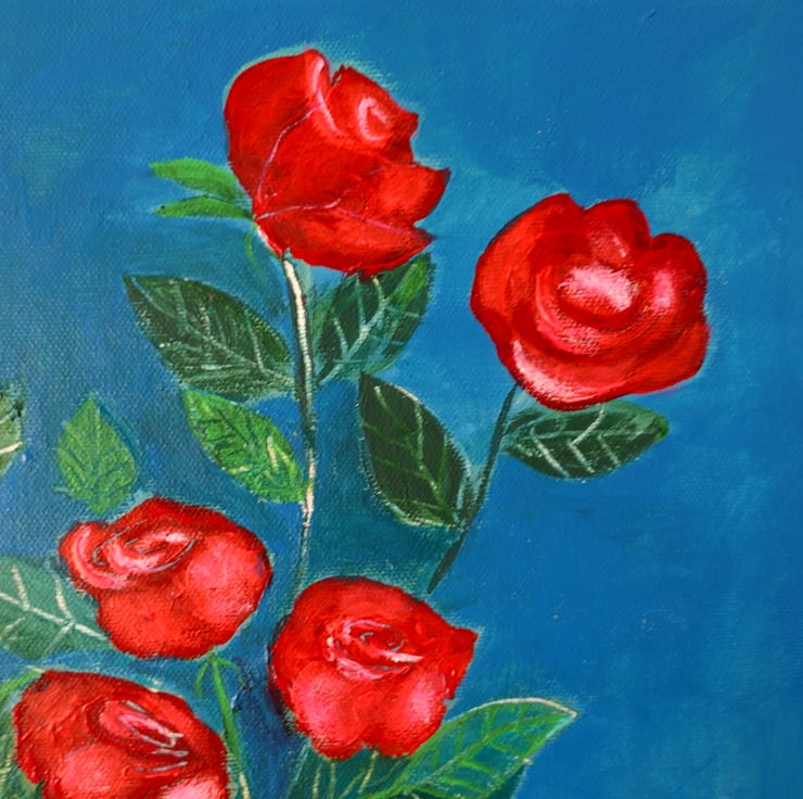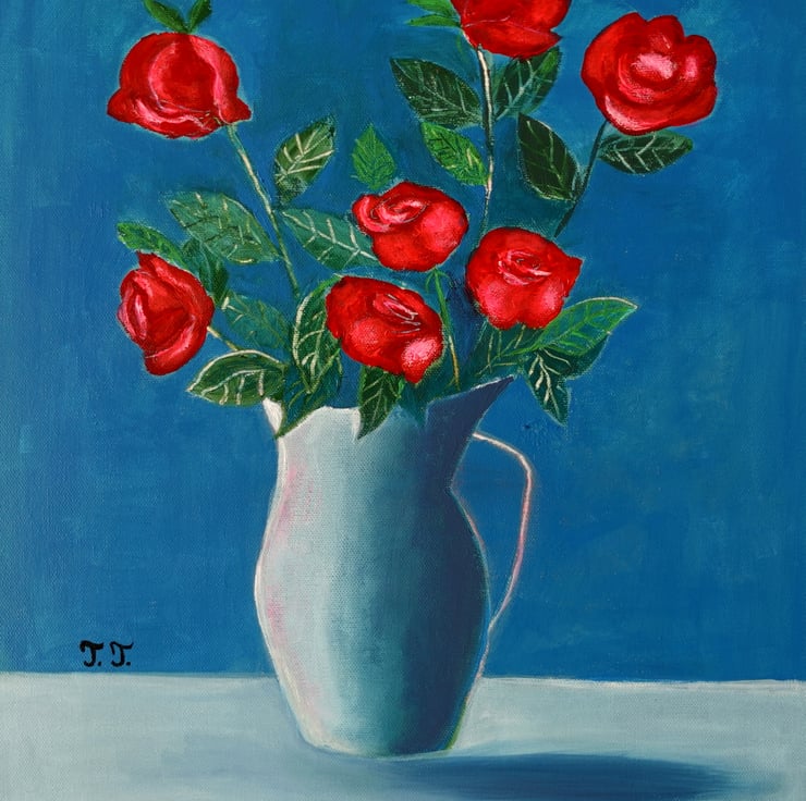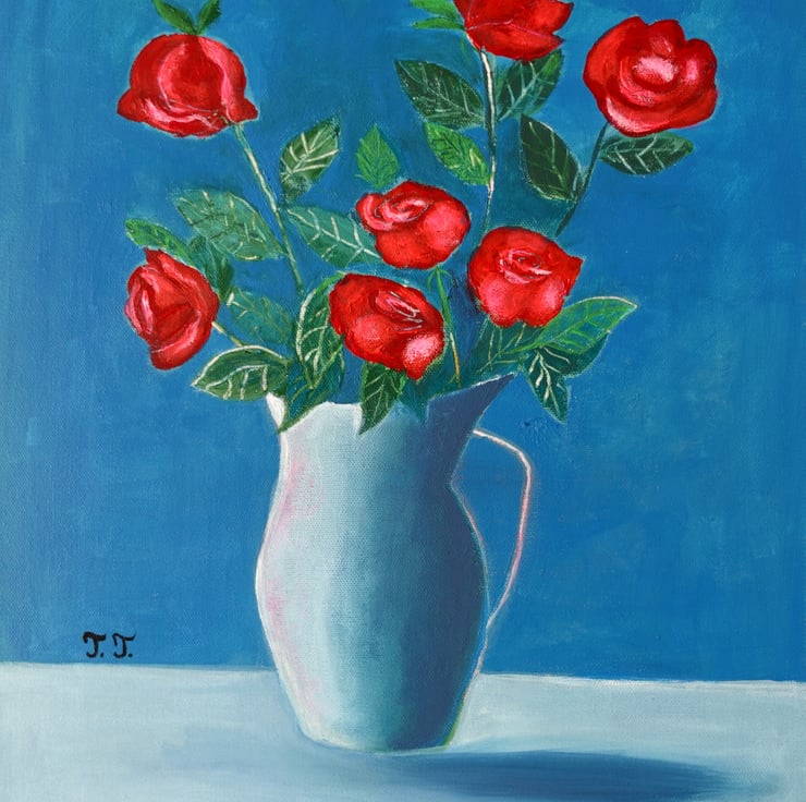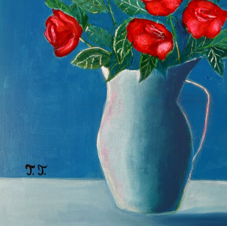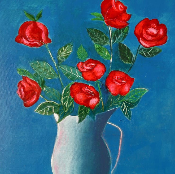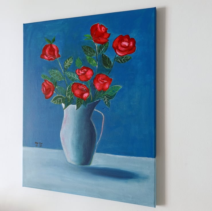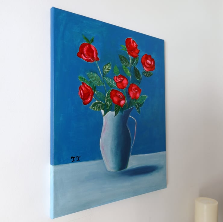 I created this original rose painting using acrylic paints on canvas using a limited colour palette of red and green for the roses and blue and white for the vase and background. I tried to capture the light and the shadow in a modern way thus making this artwork suitable for a variety of interiors. My still-life paintings are very popular as wedding gifts or birthday gifts, but they can be bought as Valentine's or Birthday presents. The edges of this floral artwork are also painted so it can be hung straight away.