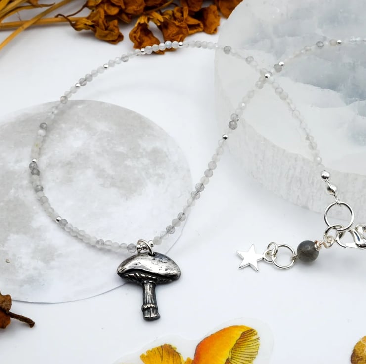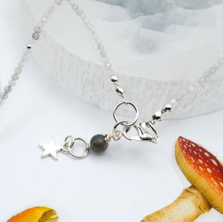 Handmade with lots of love in the East Midlands using recycled, solid fine silver, sterling silver components including clasp and round accent beads; finished with genuine 2mm White Moonstone and Labradorite gemstone beads.