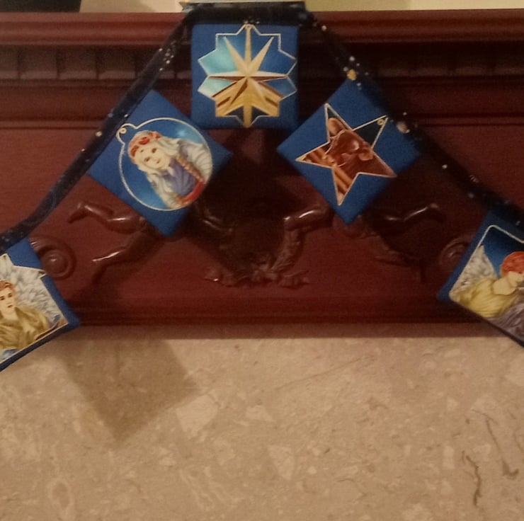 This bunting is 1.4m long with 30cm ties, and has 11 flags of the angels and manger animals.