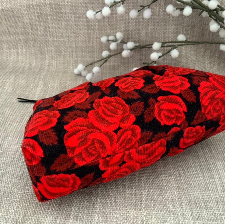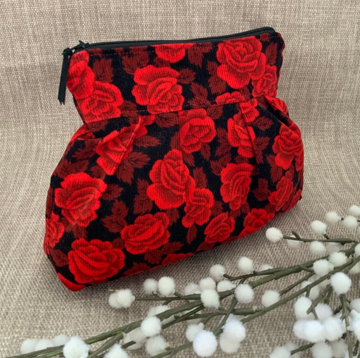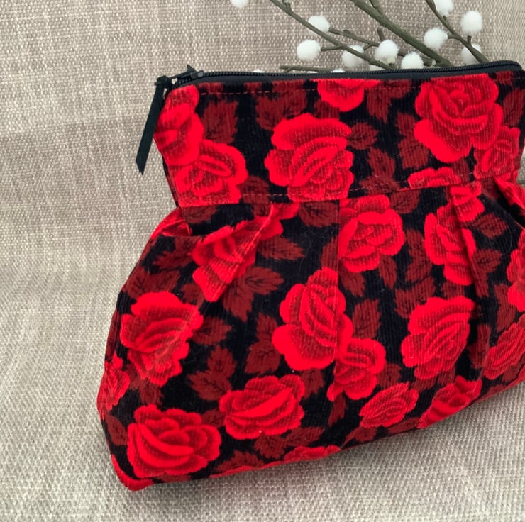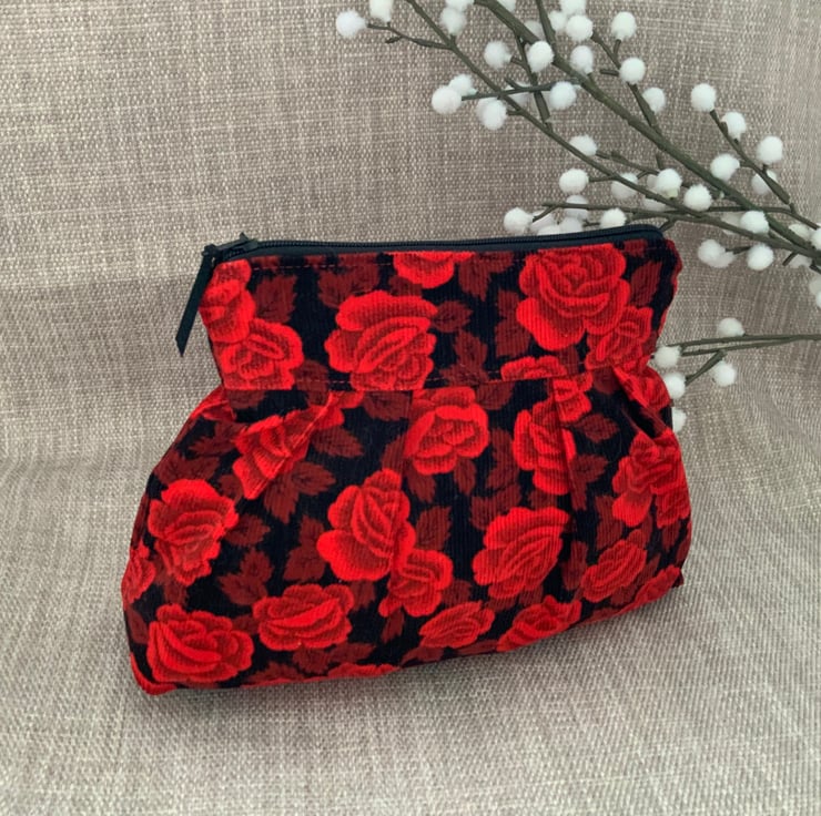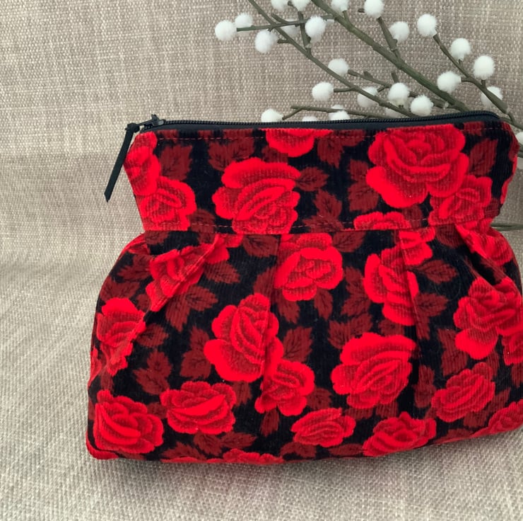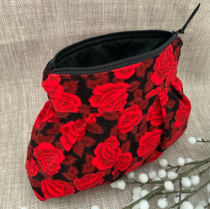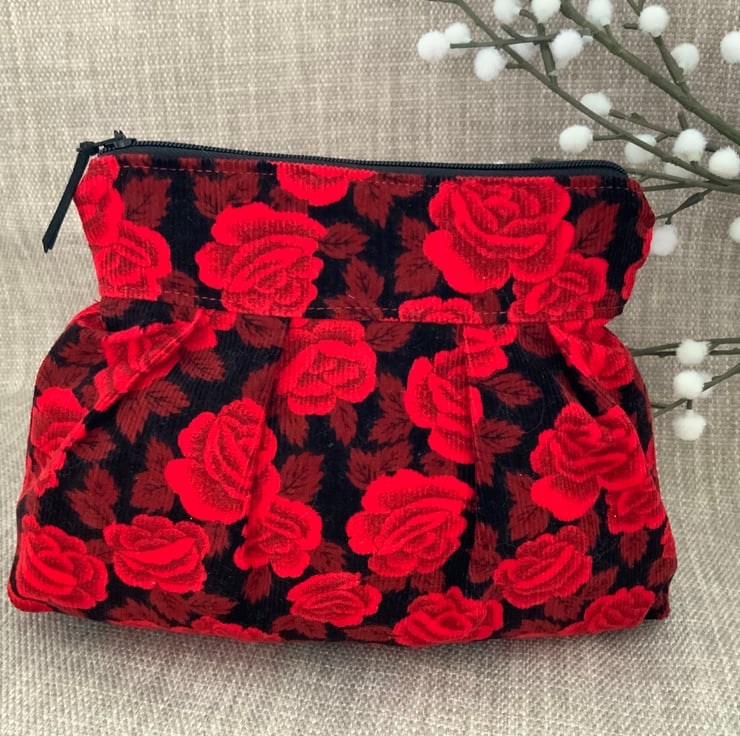 Beautiful pleated cosmetic make up bags, zipped purse. Made from a gorgeous red and black fine cord fabric in a floral design, lined with black cotton which is interlined to give it a little structure and soft to touch. Finished with faux suede cord on zip.