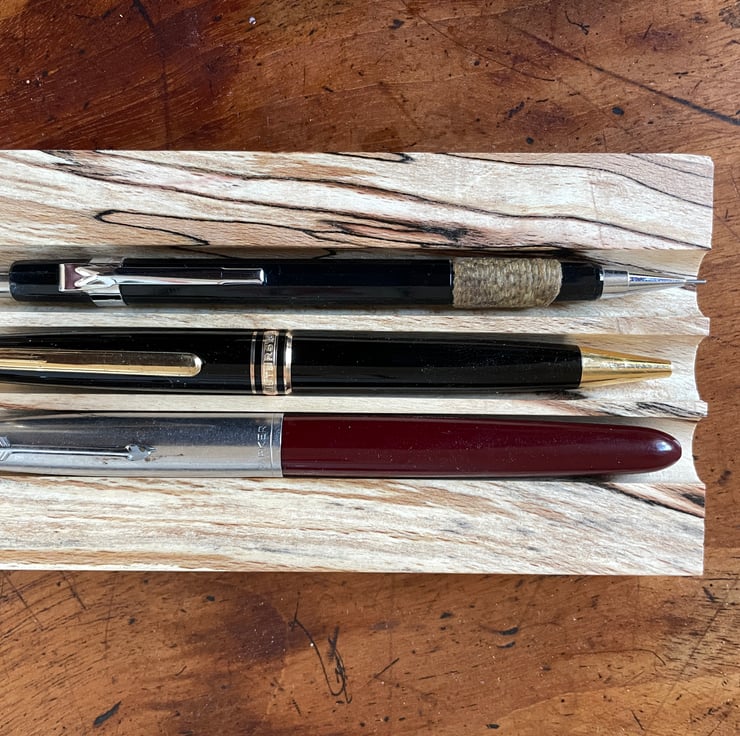 This pen holder is made from spalted Beech. Spalted Beech is caused by a fungus that grows on dead wood. It takes the fungus 2-3 years to develop in the wood to the extent shown here and fungal growth has to be stopped at the right time. Too soon and the patterns don’t develop, too late and the wood rots!