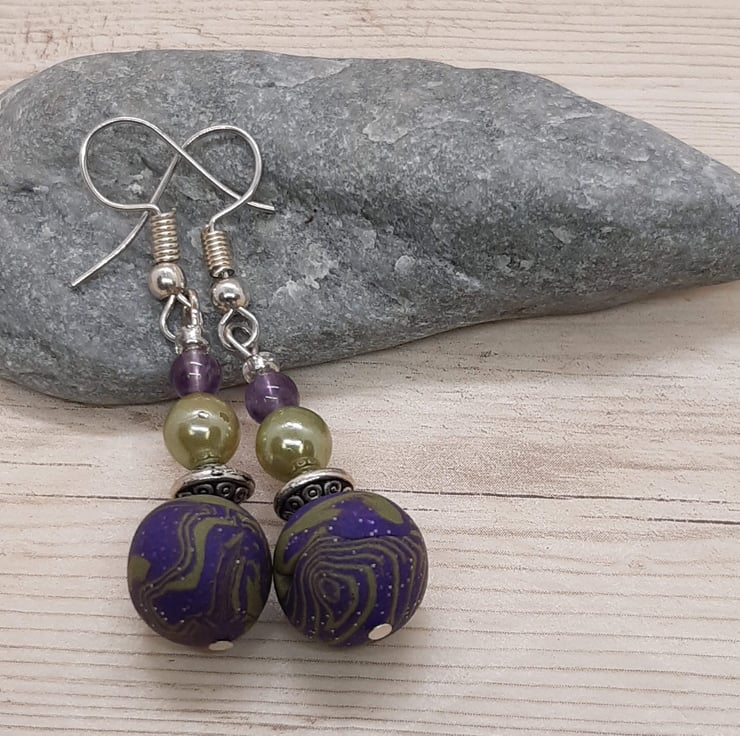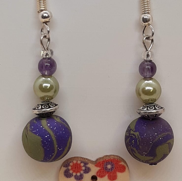 Polymer clay dangly earrings in a sage green and purple swirl design with a hint of sparkle.