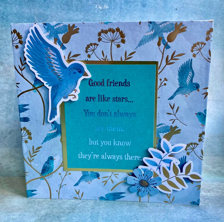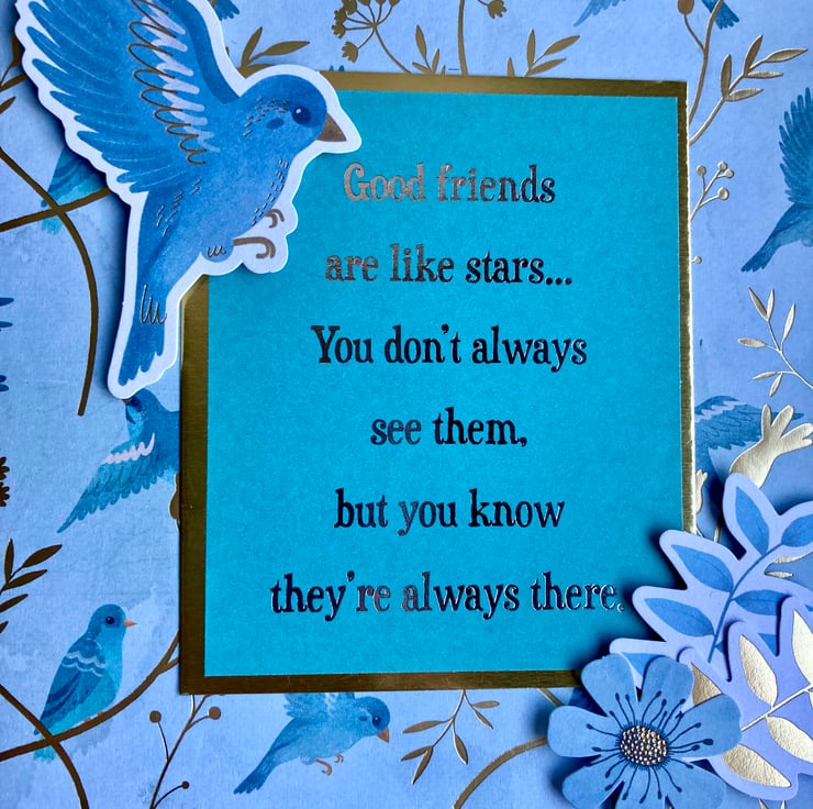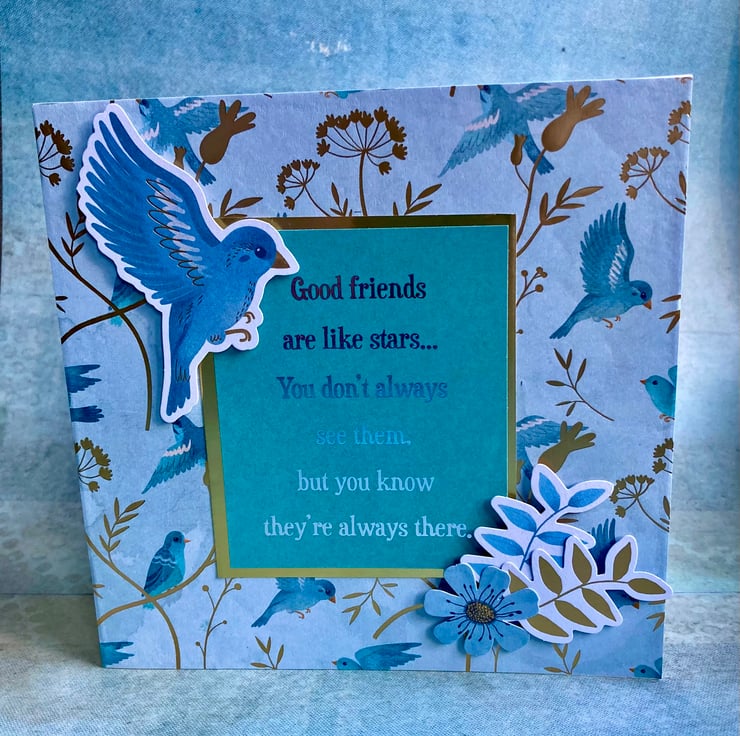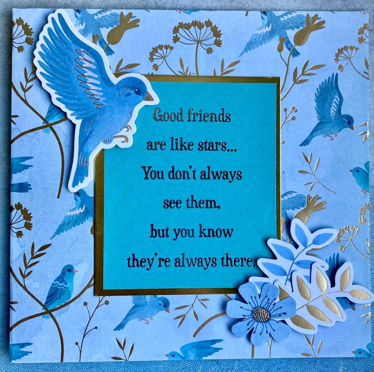 The hammered white base card has been layered with a blue paper printed with birds and gold flowers. The phrase ‘Good friends are like stars…. You don’t always see them, but you know they’re always there’ has been added with silver lettering on a blue background with a gold surround.