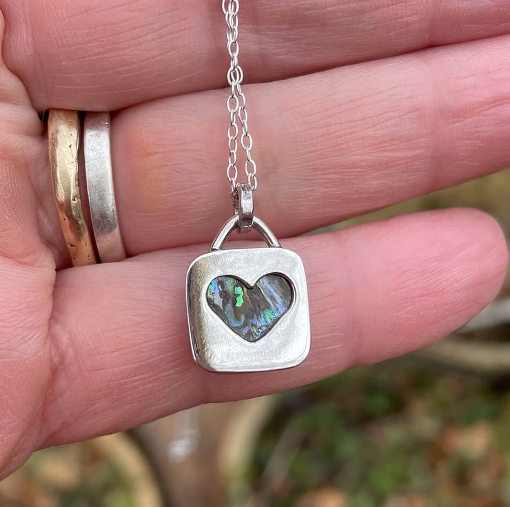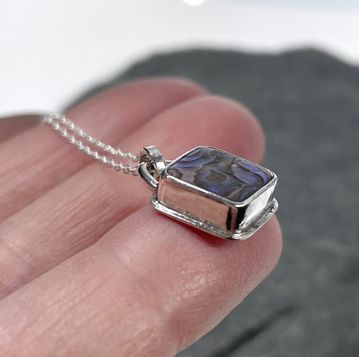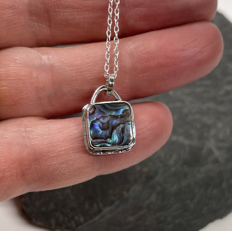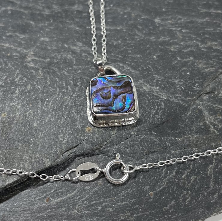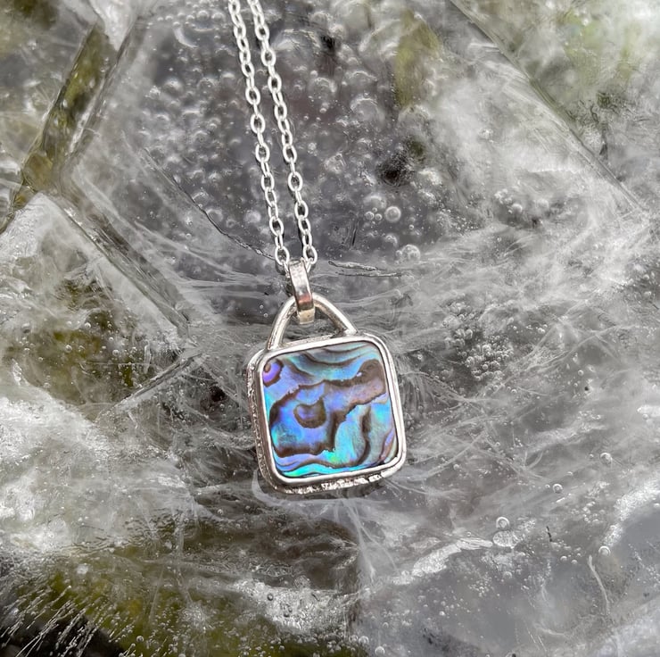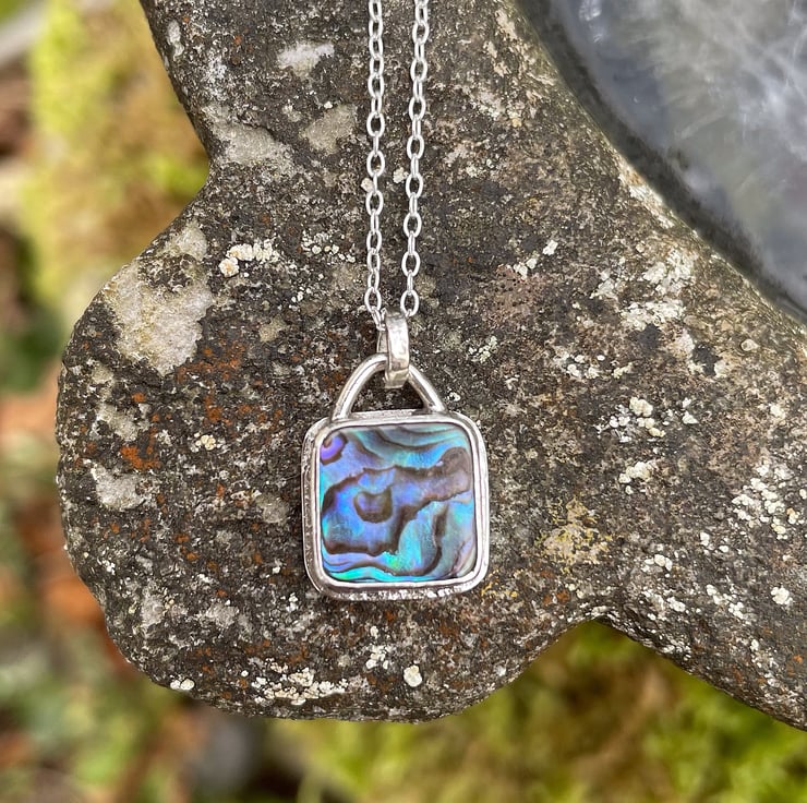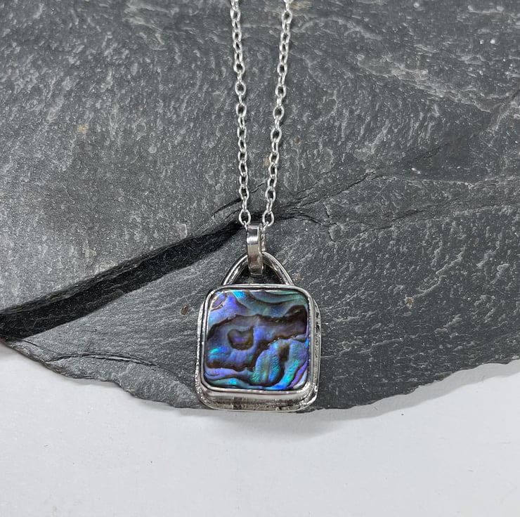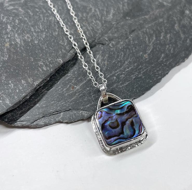 A simple little pendant set with a magical square of abalone shell hung from an 18 inch chain