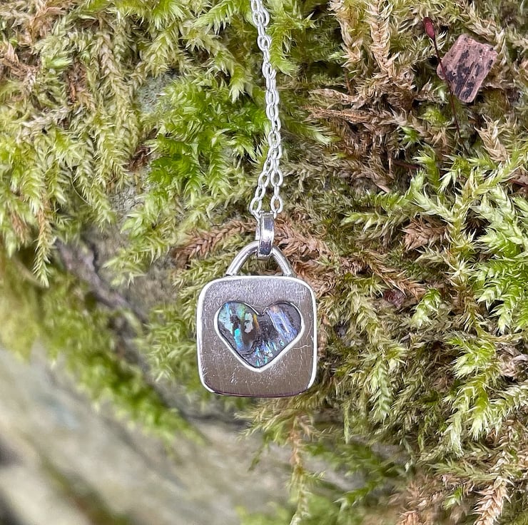 This lovely abalone square has swirling patterns in purple, blues and green. It is double sided, so I have cut a heart out of the back so more colour can shine through.