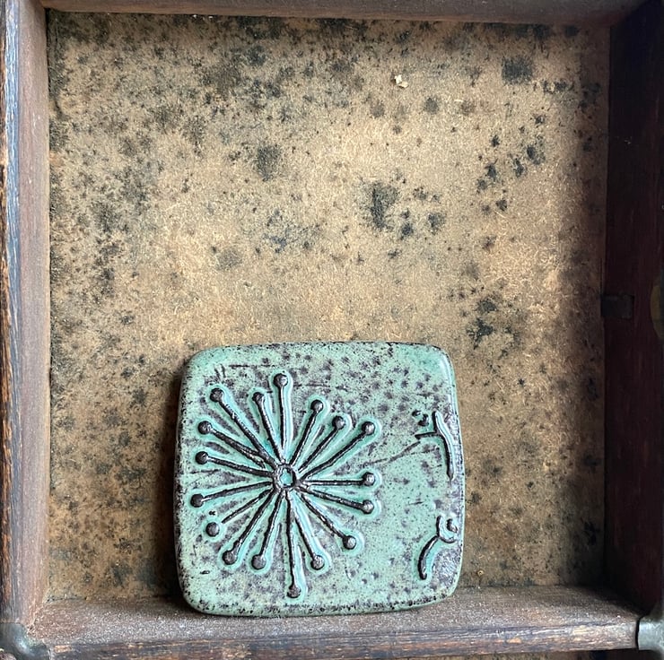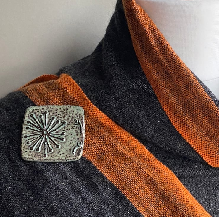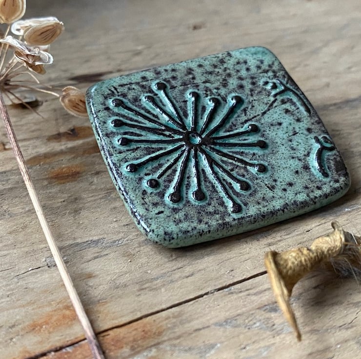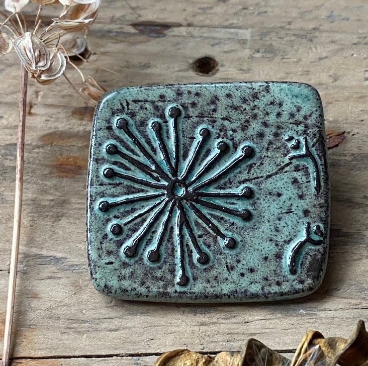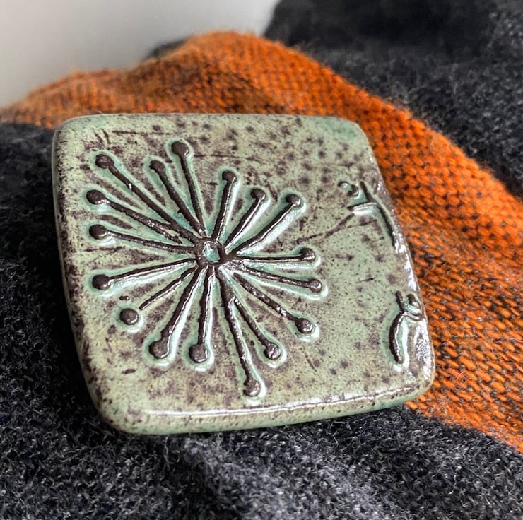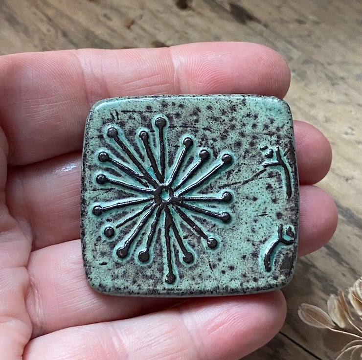 This Square shaped Brooch is Imprinted with a unique MatildaBelle carving inspired by the natural flower beds surrounding the pottery studio.