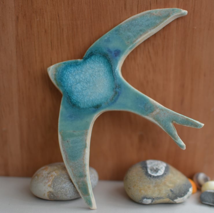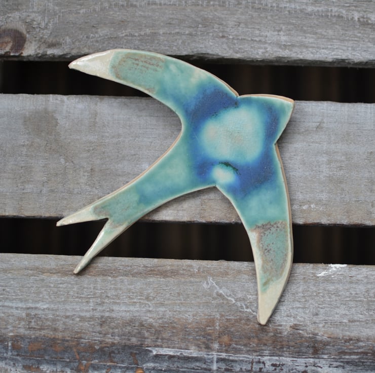 A Swift glazed in blues and turquoise designed to hang on the wall