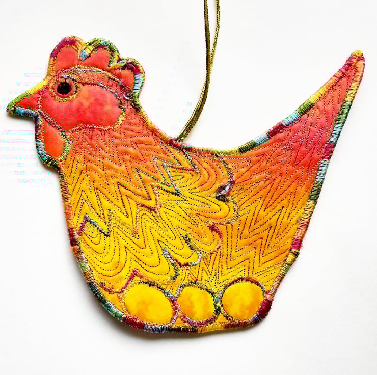 This is a handmade textile hen hanging decoration, sitting on 3 golden eggs.