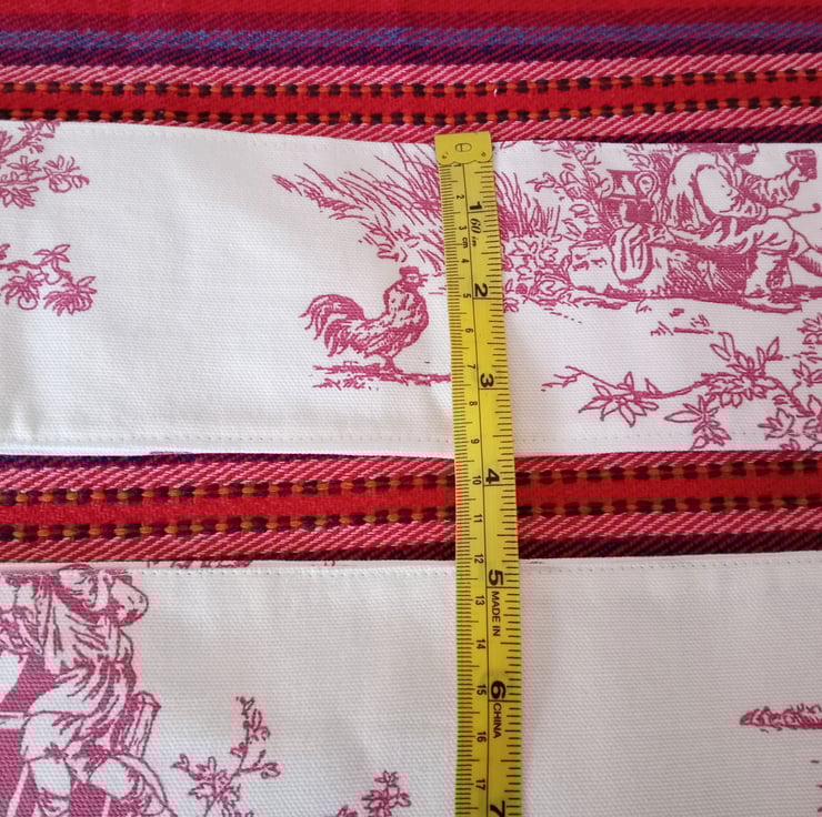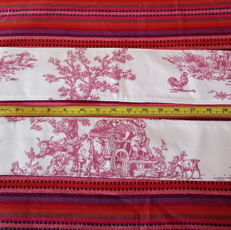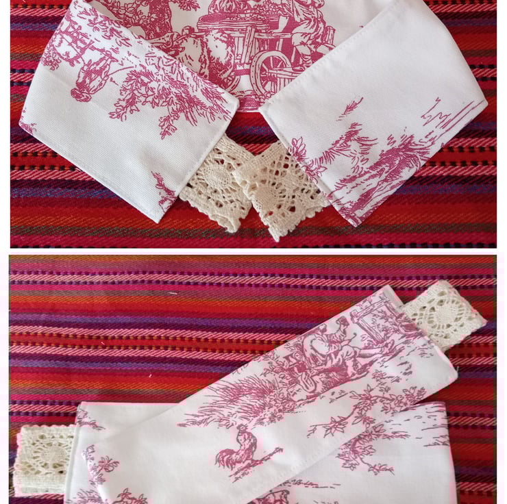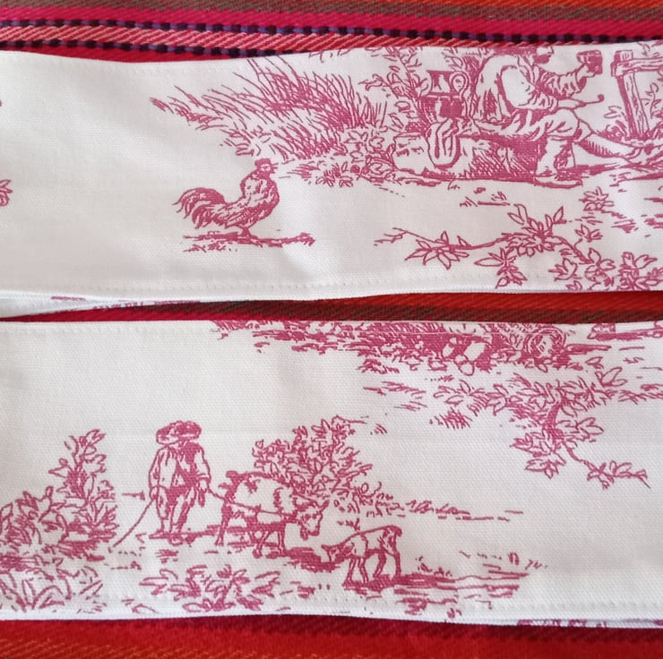 Pretty cream and dusky rose toile de Jouy cotton fabric with cotton lace loops to go over hooks.