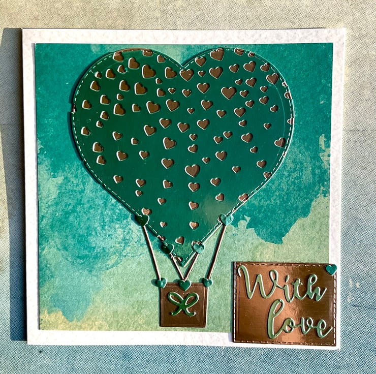Set on a white hammered card base this card features a blue/green and rose gold metallic heart which has been die cut with a cascade of smaller hearts set on a teal patterned background.