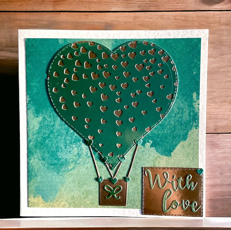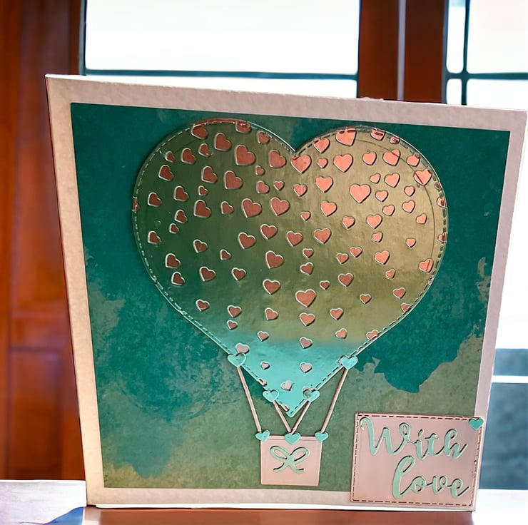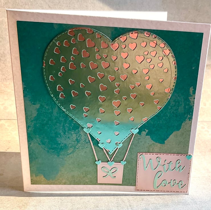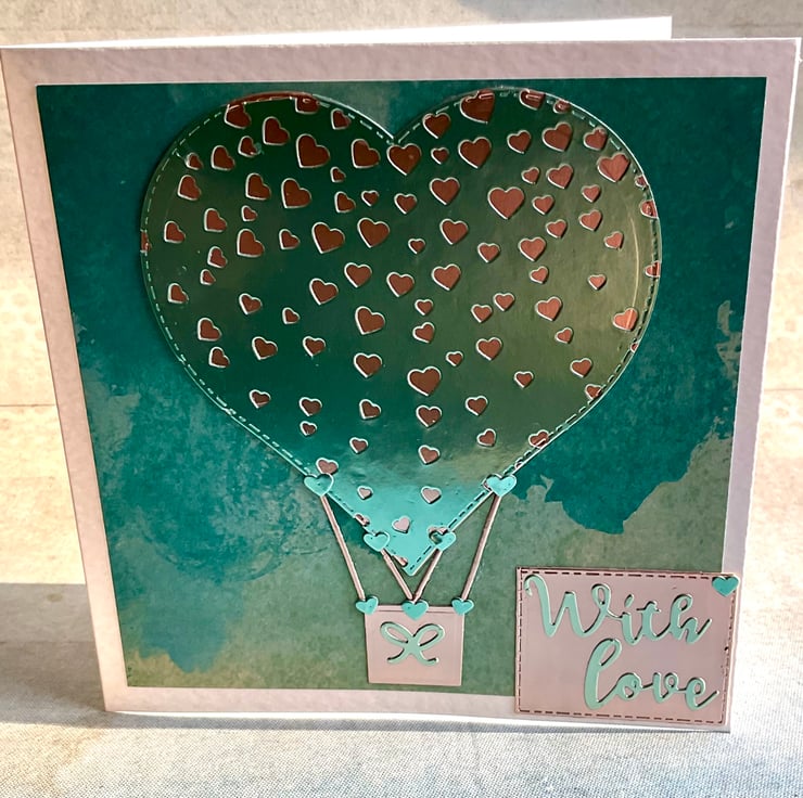 A unique hand crafted hot air balloon inspired card suitable for Valentines Day, a Wedding or Anniversary.