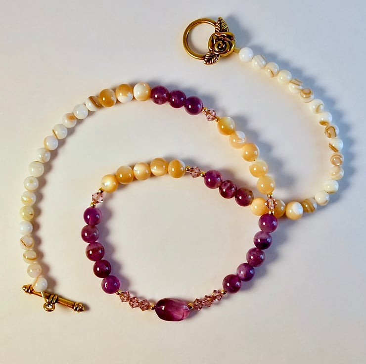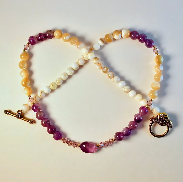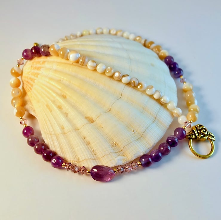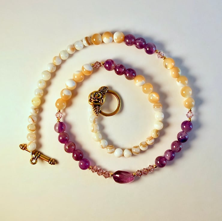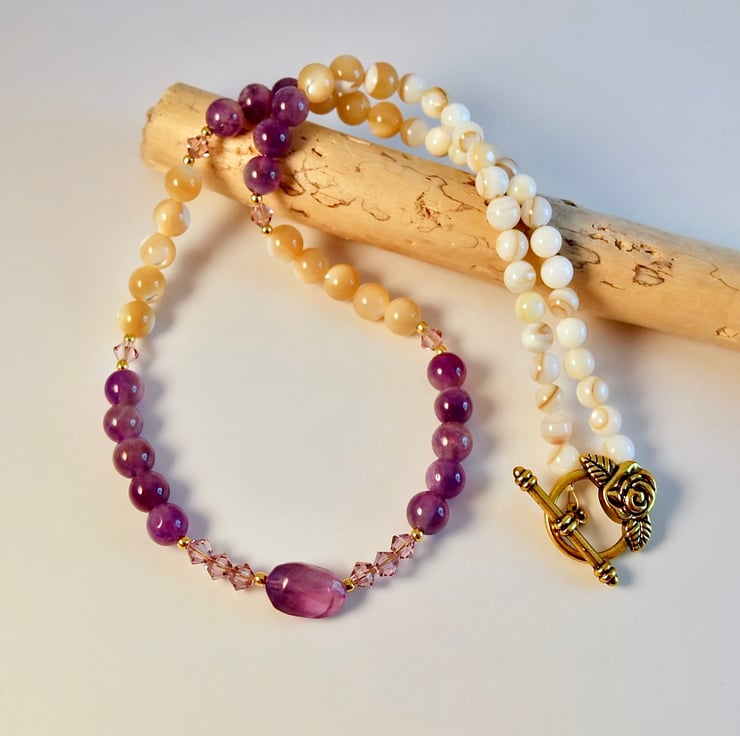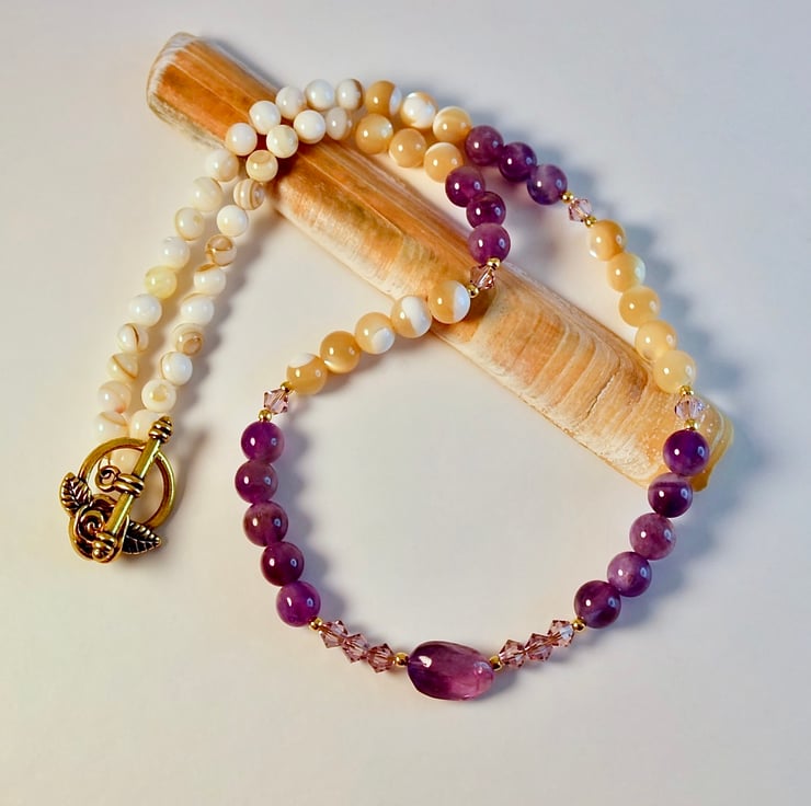 A mix of 6mm Amethyst and 6mm Mother-of-Pearl beads, separated by sparkling Swarovski 'light amethyst' crystals which catch the light beautifully, with a central oval Amethyst stone set between trios of Swarovski crystals.