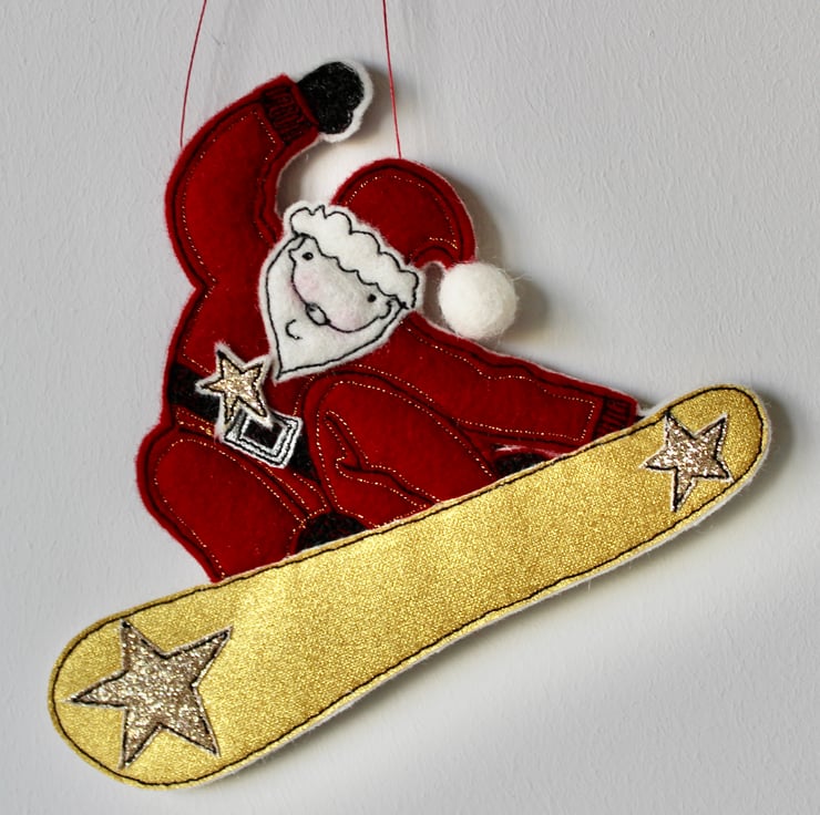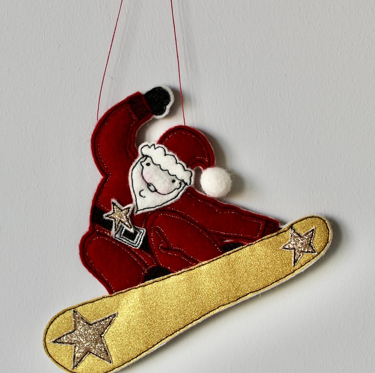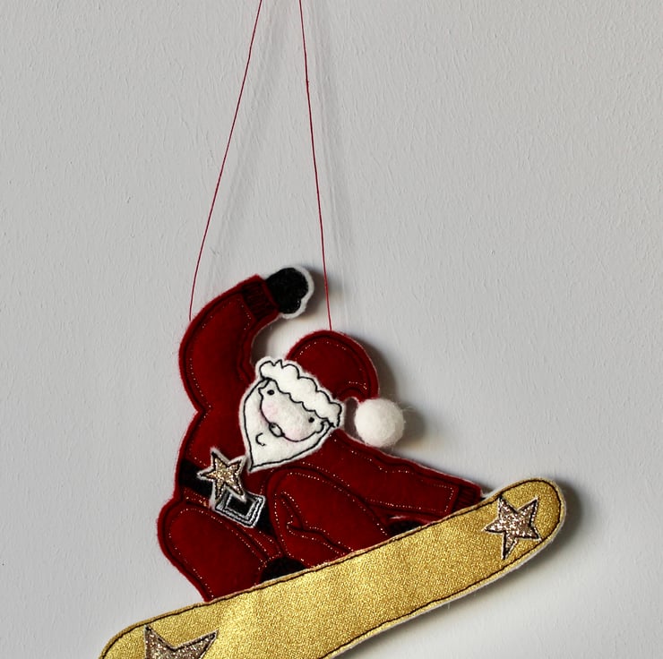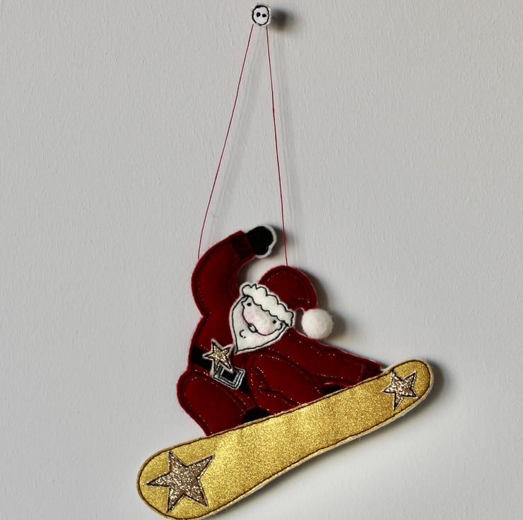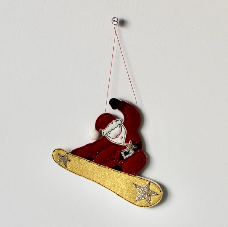 Suspend 'Snowboarding Father Christmas' using the linen thread loop and it will make a stylish statement.