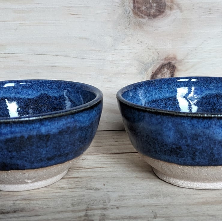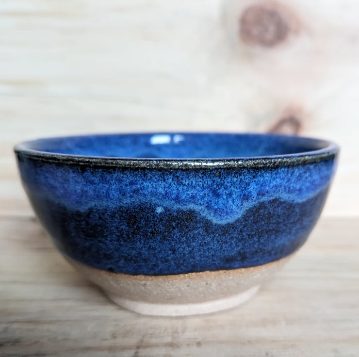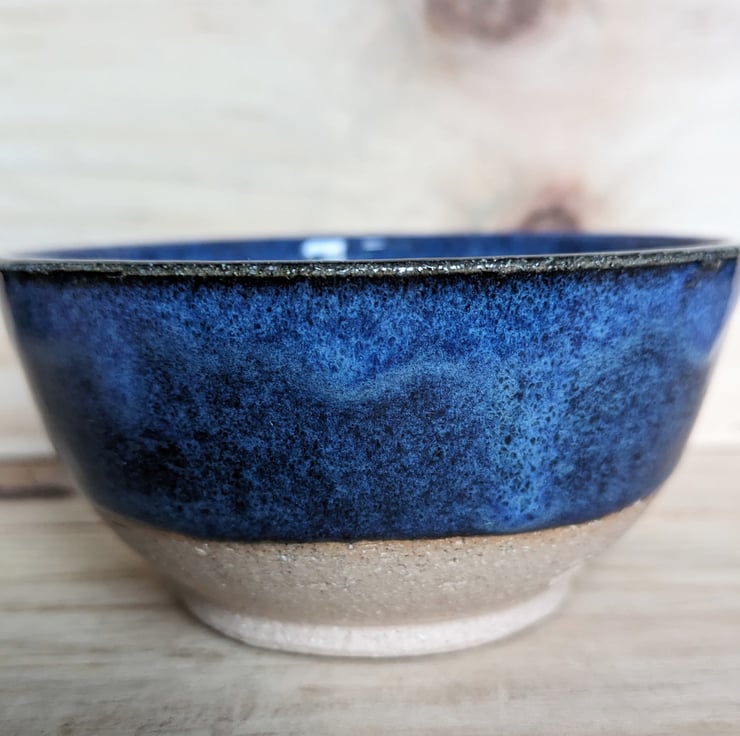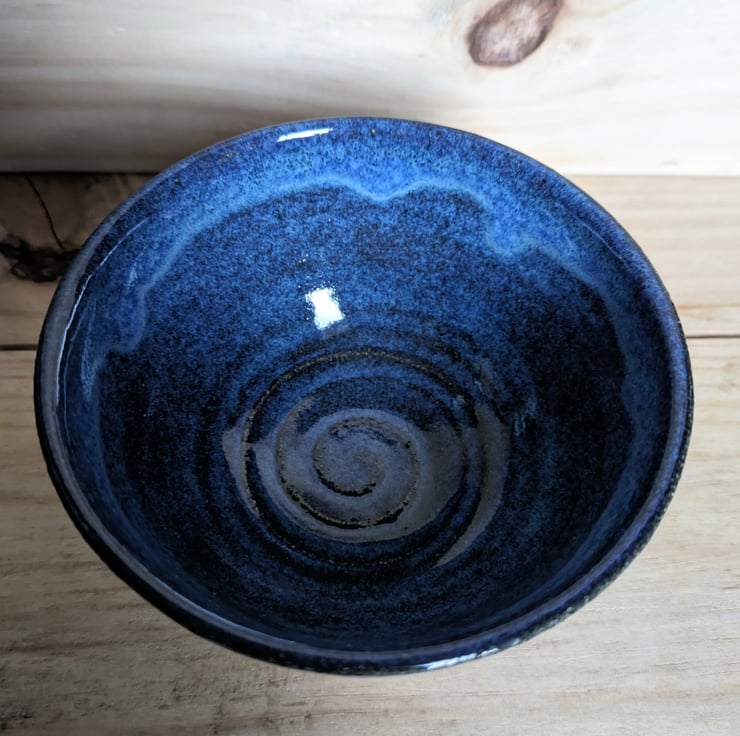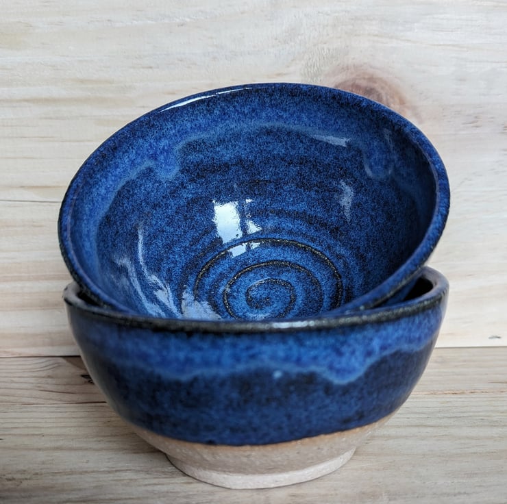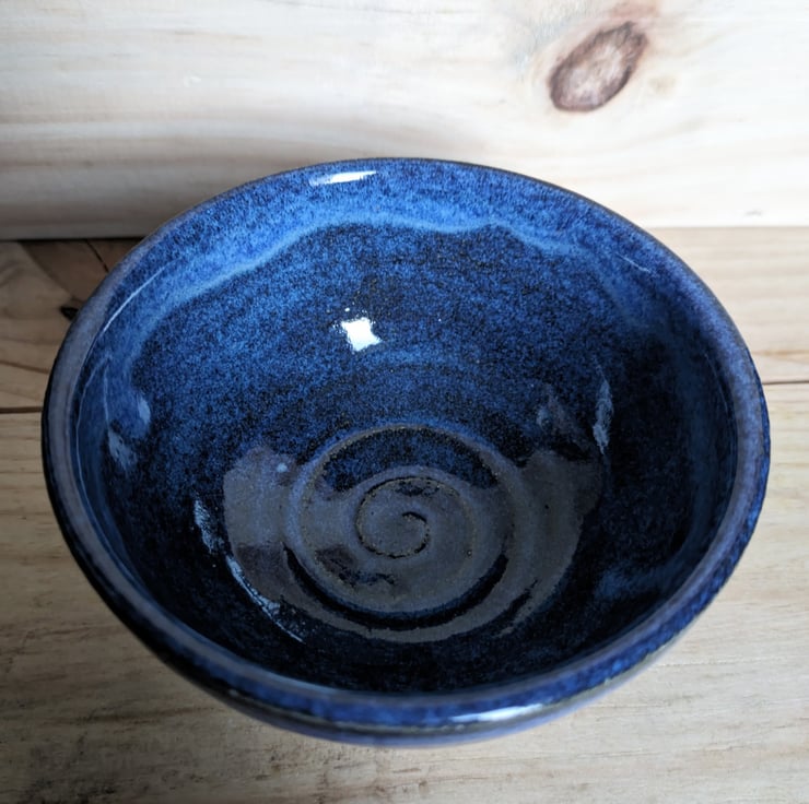 I've used a textured clay and have left the bottom edge of the clay exposed on the outside so that you can feel it. Love this blue and the way it floats down from the edge & each one comes out of the kiln a bit different. The glaze also breaks over the swirl in the base. Fired in a kiln at a stoneware temperature (c1200 degrees) which makes them more durable.
