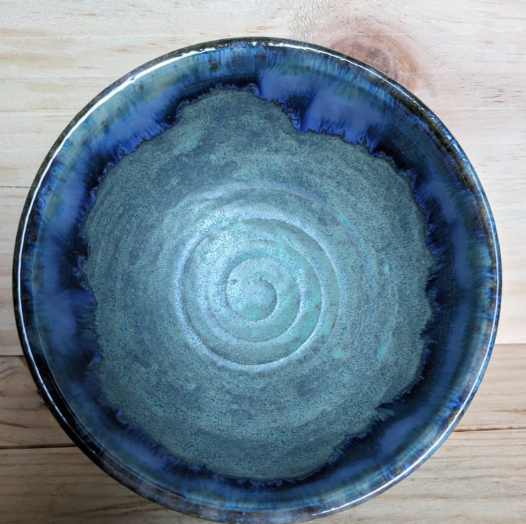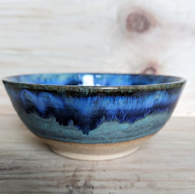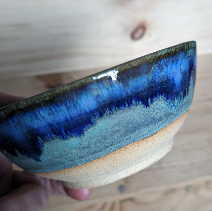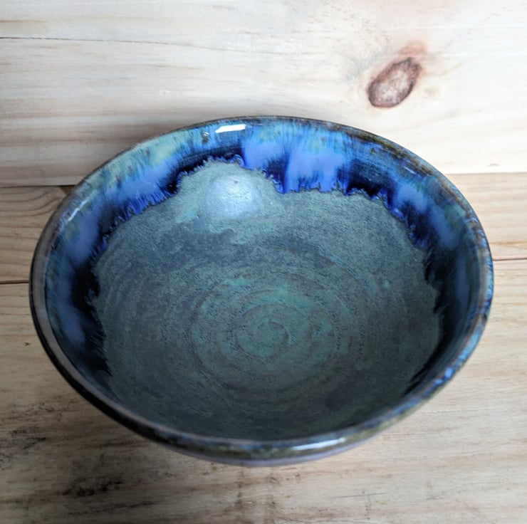 I've used a matte green glaze with a flux on the rim edge which brings out a totally different colour of the glaze. Love the way it drops and the glaze "feathers" down as a blue hue. This bowl would make a lovely serving dish for dips, nibbles, olives, antipasti or whatever you fancy!! A textured clay which I love leaving exposed at the bottom edge on the outside. Fired in a kiln at a stoneware temperature (c1200 degrees) makes it durable.