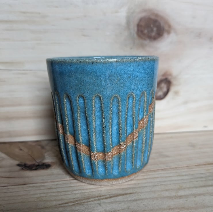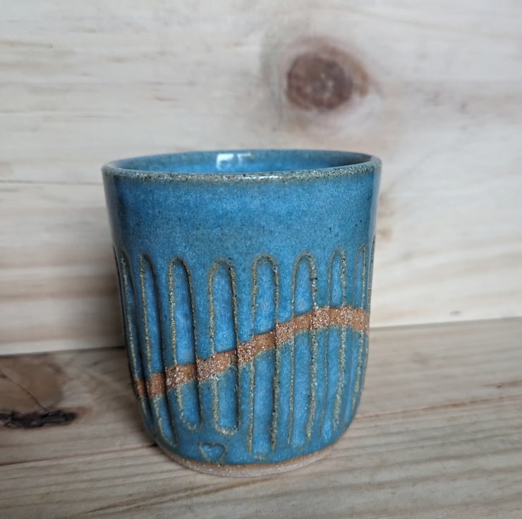 I've used a textured clay for this mid-sized tumbler which you can see some speckles poking through. This tumbler has carved sides and have left a strip of bare clay running round it. Fired to c1200 degrees (stoneware temperature) and this makes the tumbler more durable.