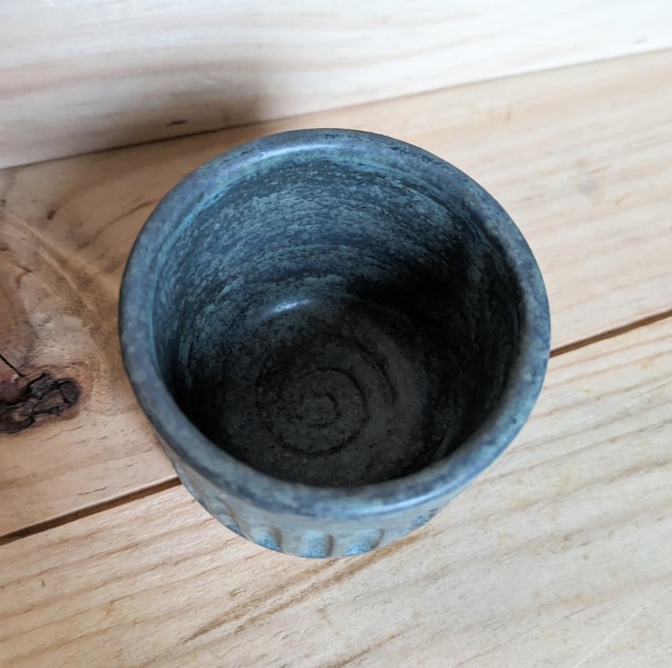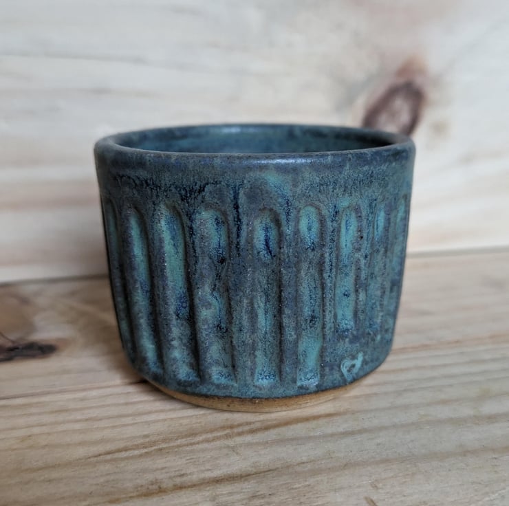 I've used a textured clay for this tumbler and have left a little of it exposed at the very bottom outside edge so you can feel it. This matte greeny blue glaze comes up almost marbly and is lovely on the carved area which helps dissipate the heat from your fingers!! This is a one-off! Fired to c1200 degrees (stoneware temperature) and this makes the tumblers more durable.