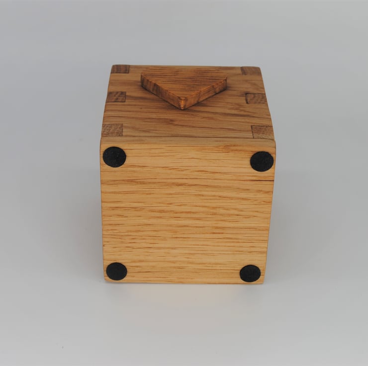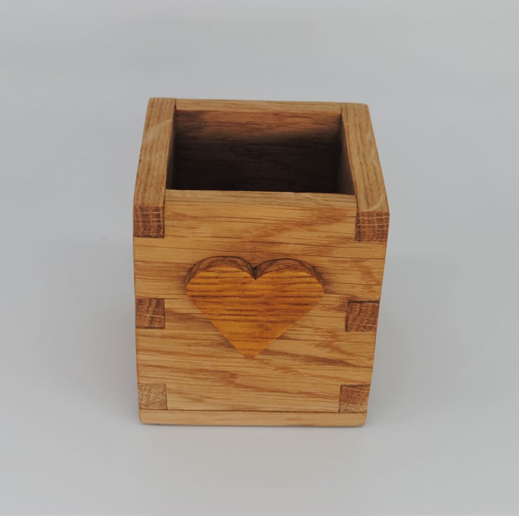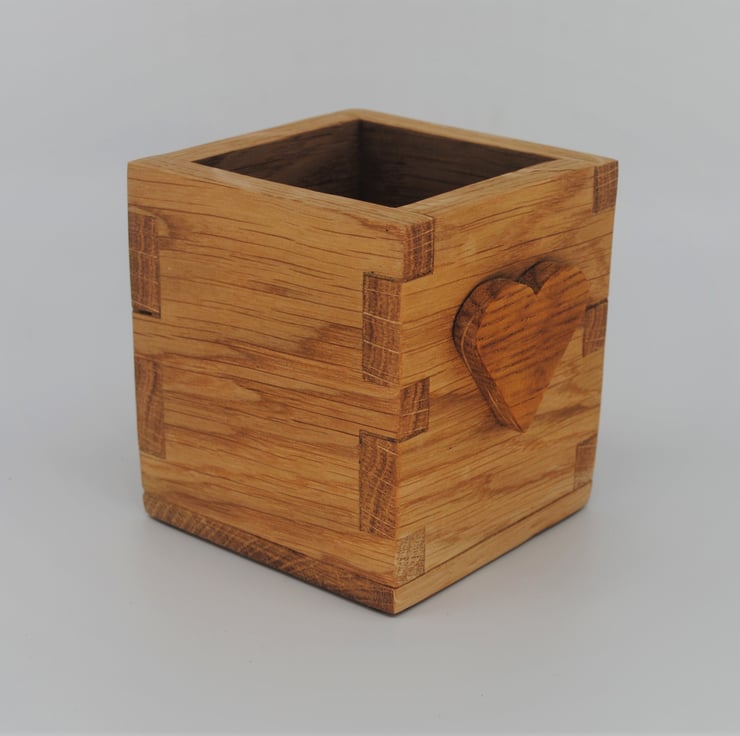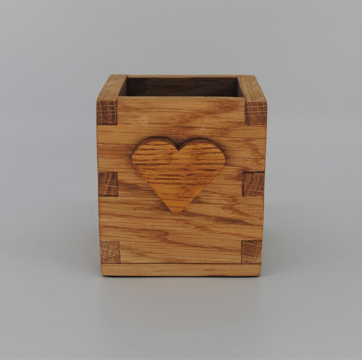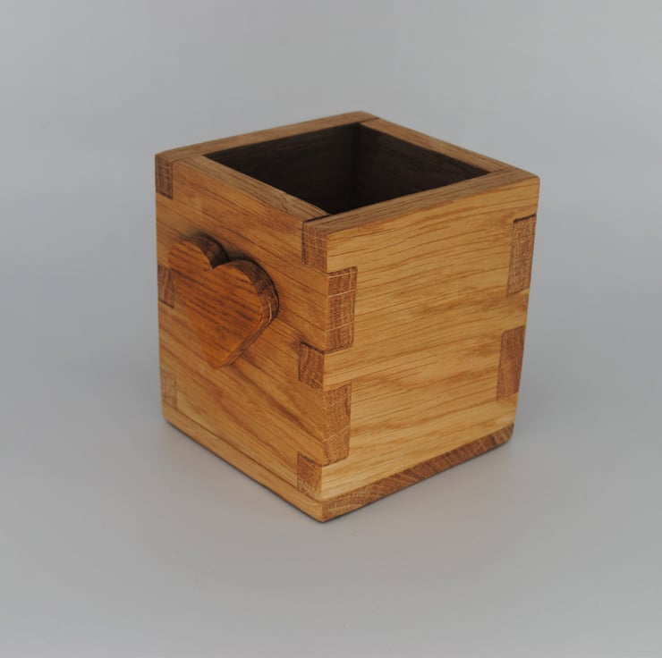 This small decorative box is made from solid Oak, and is ideal for a small trinket box, or a small pencil box. The Heart shape and box joins have been cut with a scroll saw, and is finished with Danish oil to show off the natural grain of the wood.