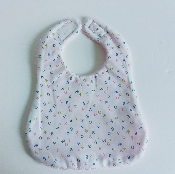 A small towelling backed bib suitable for 0-3 months with a velcro fastening. It features an ABC design and would make an ideal baby shower gift.