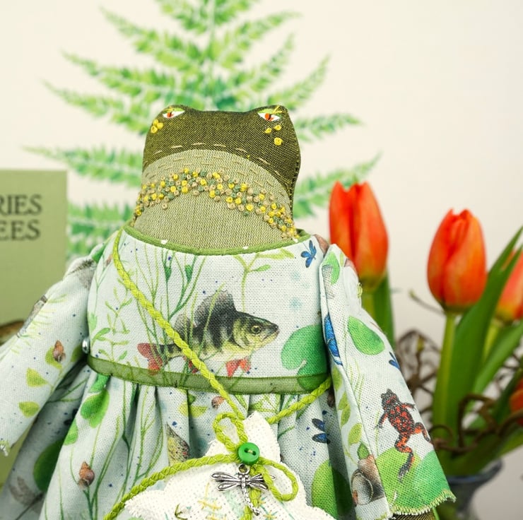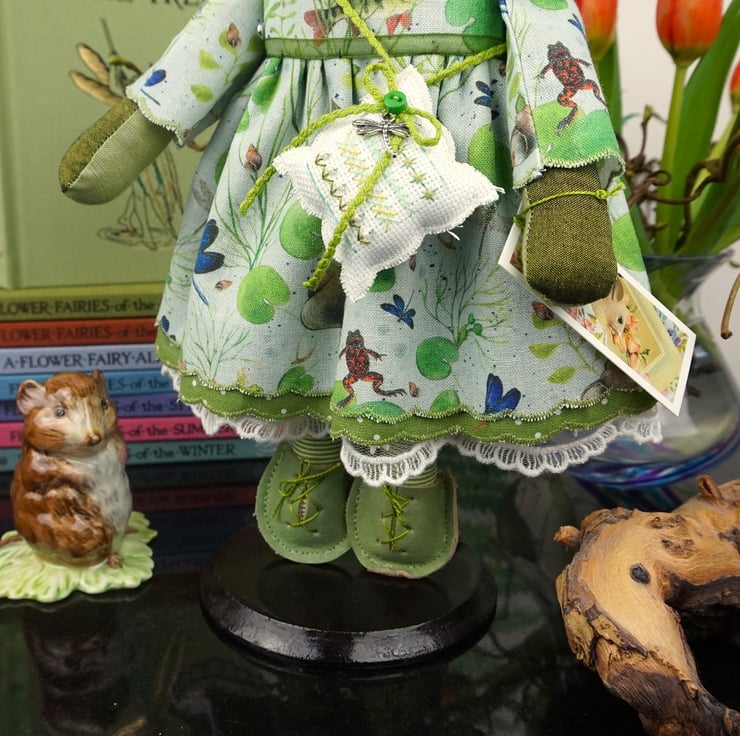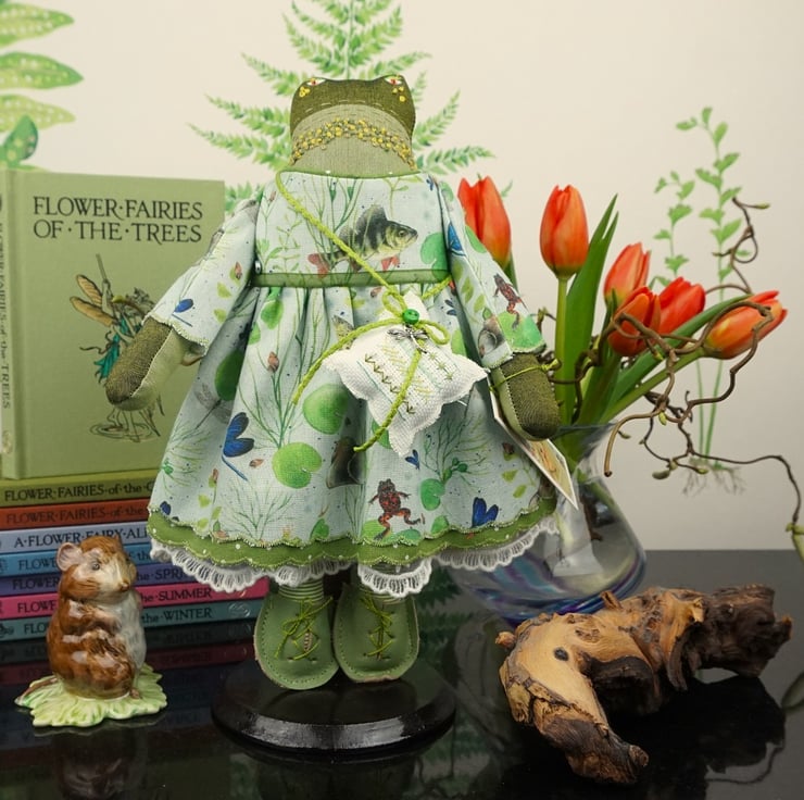 Her companion is a tiny grumpy frog with a sweet nature. She stands just nine inches tall. She is a tubby frog with hand painted features and hand embroidered details. She is dressed in a lovely fine cotton by Acufactum called By the River with coordinating underskirts in cotton and lace and bloomers in broderie anglais cotton..