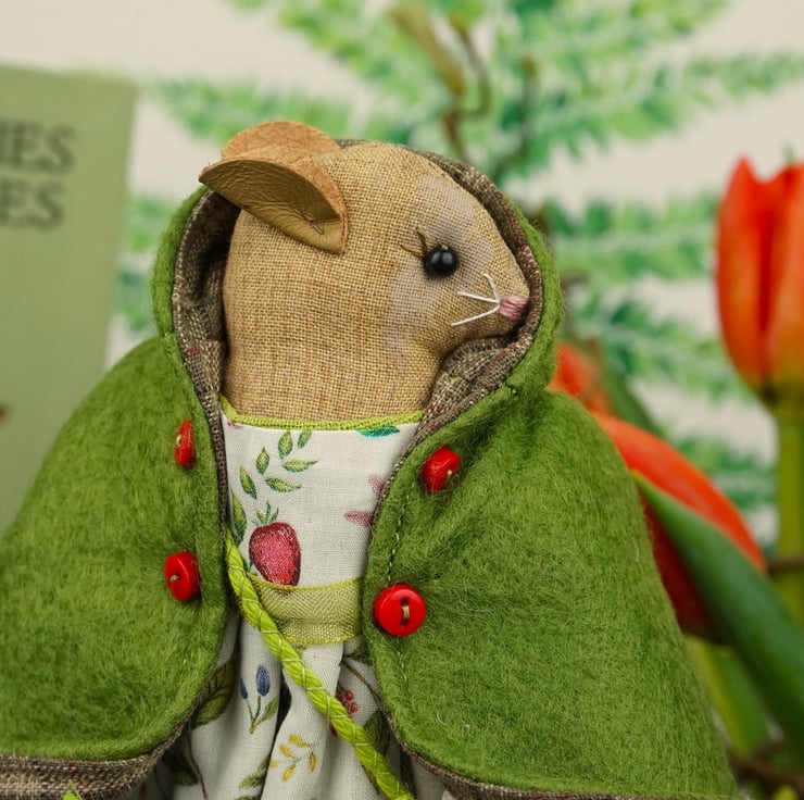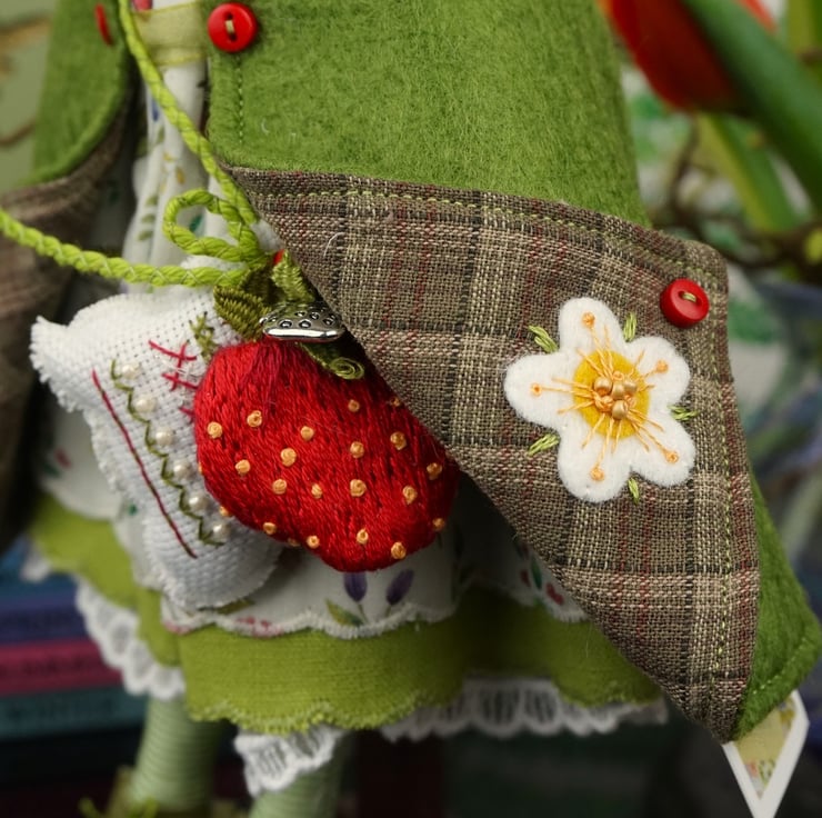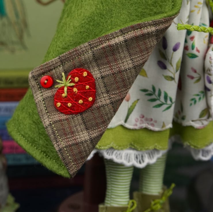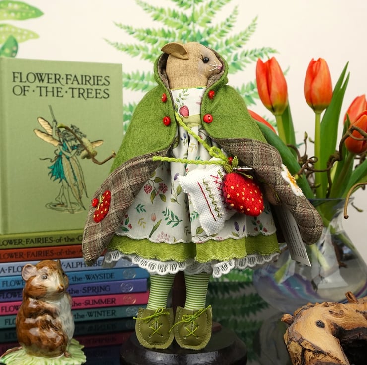 This is a special order for Annie Moon. She is a hand embroidered mouse with little leather ears and tail. She is dressed in a an applique and embroidered cape with strawberry fruits and flowers at the corners. She has coordinating dress in Little Berry Liberty Lawn with green linen and tulle lace underskirts with cotton lace bloomers. Her dress is finished with organza ribbon, tiny buttons and little leather shoes.