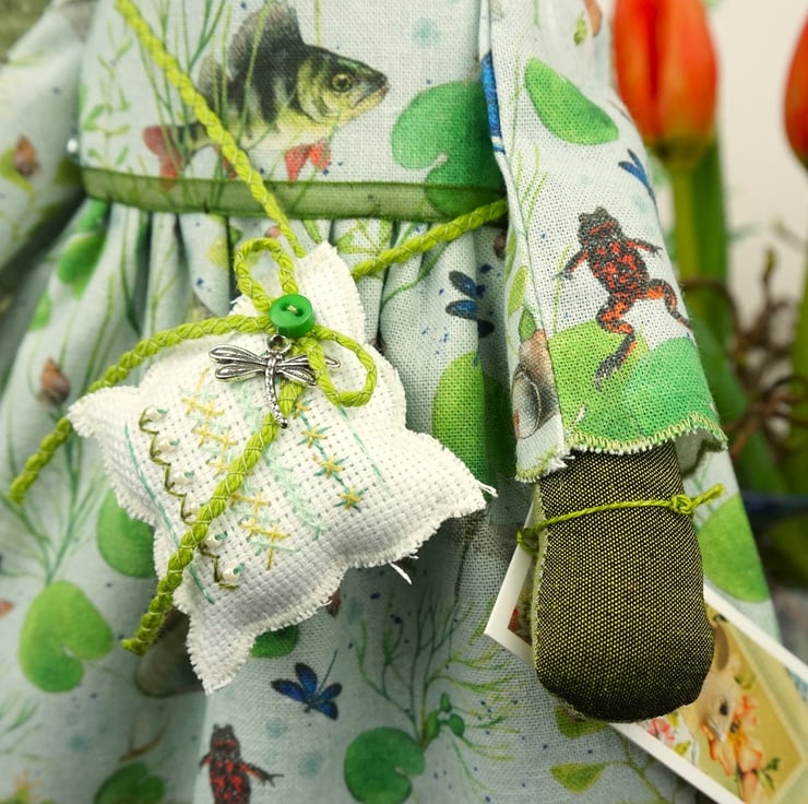 She is softly stuffed with a good stuffing, has a malachite crystal heart and lots of rosemary in her stuffing for a gentle scent. She is finished with organza ribbon, tiny buttons and little leather shoes. She has a little sampler sachet with a dragonfly charm.