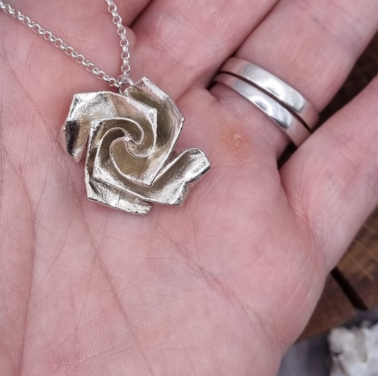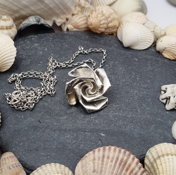 This piece is made from a real origami rose coated in silver. It measures approximately 2.8cm high by 2.5cm across and is supplied on an 18 inch sterling silver necklace chain, different styles and length of chain can be supplied on request, please message me for a quote.