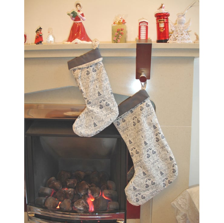 Two cotton fabrics make up this stocking with a turnover top and tag to hang from your fireplace.