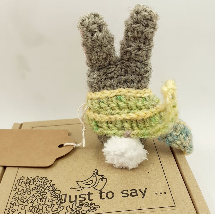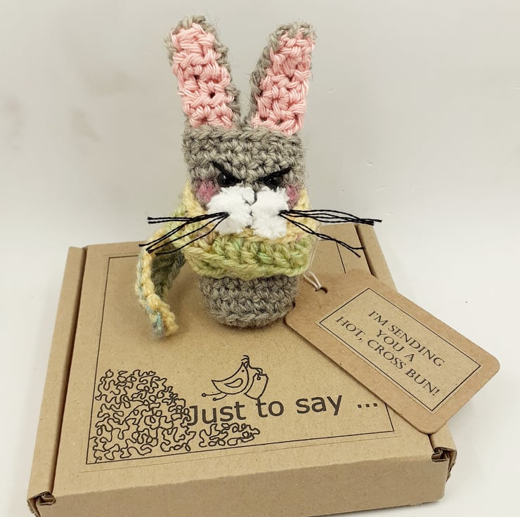 This grumpy rabbit is all set to deliver a message on your behalf. He is crocheted in a mix of acrylic and cotton yarns and has beady black eyes, a smart but overly warm scarf. He measures approximately 10 cm from the top of his ears to his pom pom tail. There is a 2p coin in the base of the bunny to help.him stand. The tag reads Here's a Hot Cross Bun for You, although I am very happy to exchange this tag for one with wording of your choice.