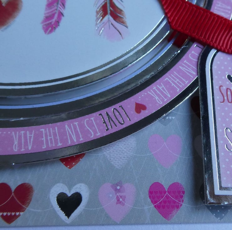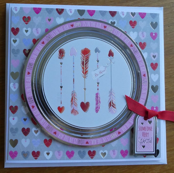 This card with images of hearts and feathers and the words Be Mine, Love is in The Air & Someone Very Special would be perfect to send as a Valentines card to someone special.