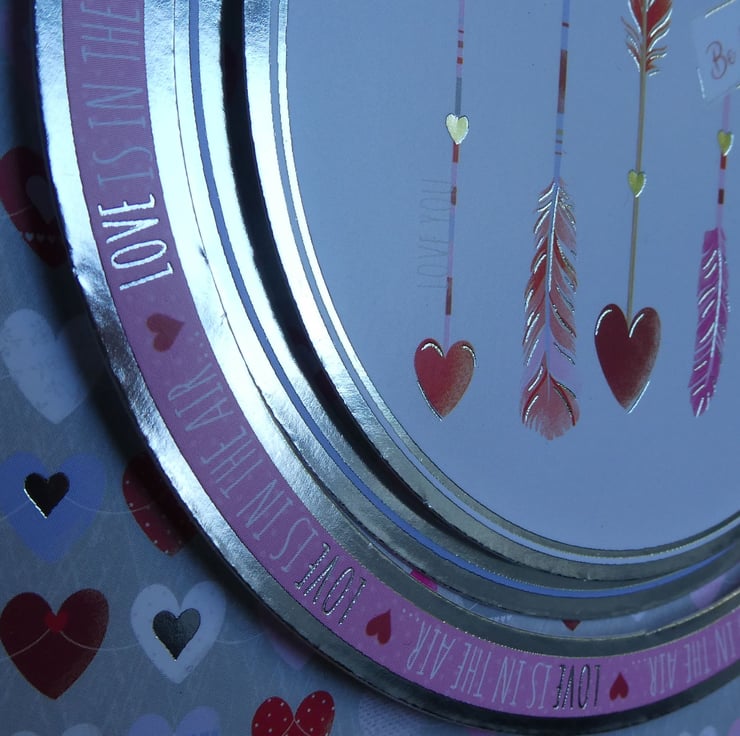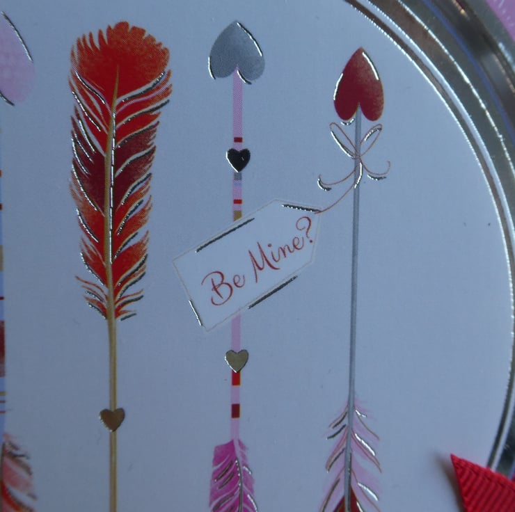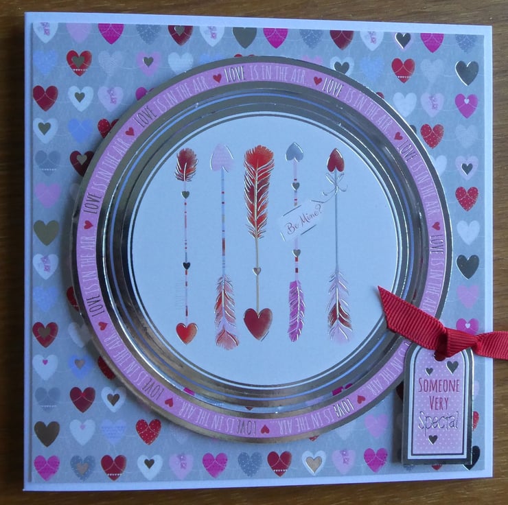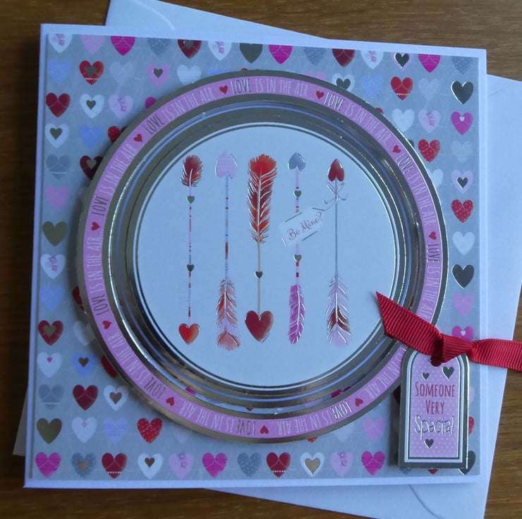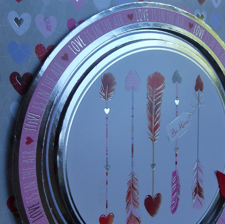A circular printed image of arrows with hearts for tips in shades of red, pink and grey with the words Be Mine? has been mounted onto a background of pale grey card with a pattern of small hearts in red, pink, grey, pale blue and foiled silver.
