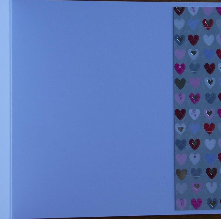 Inside the card a strip of matching heart patterned card has been added down the right hand side with space left for your own message.