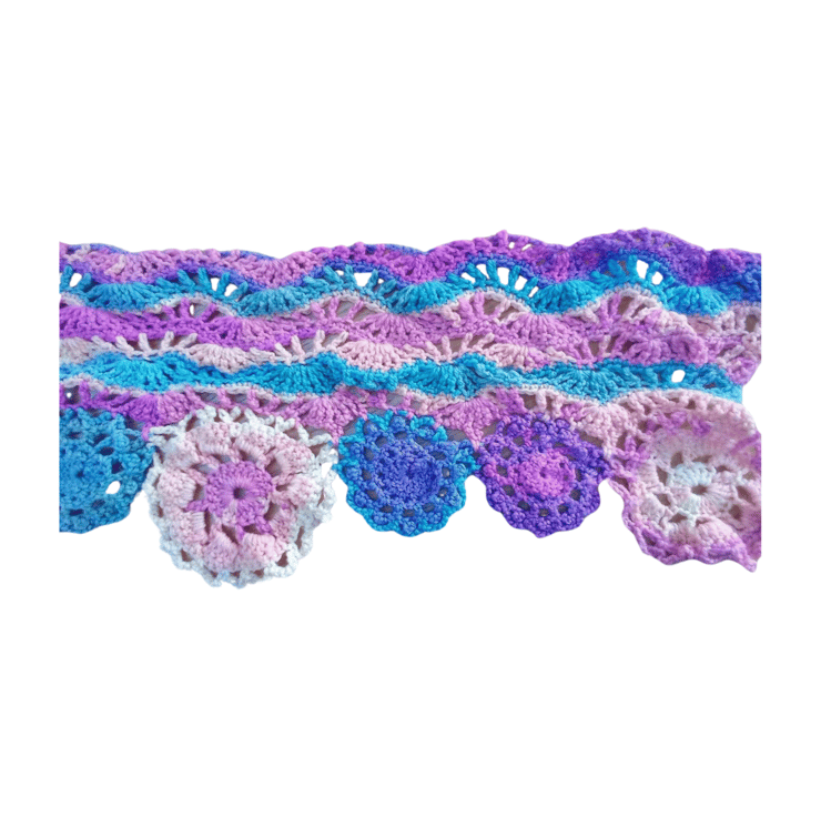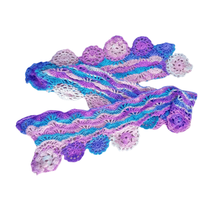 Crocheted scarf in bright multi colours. A wavy design with flowered edging. Matching bobble hat is available.