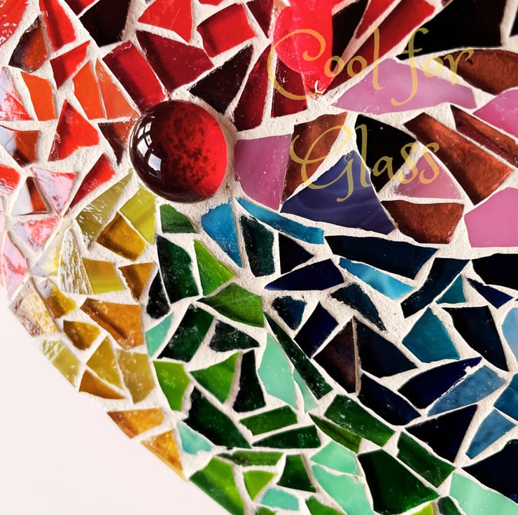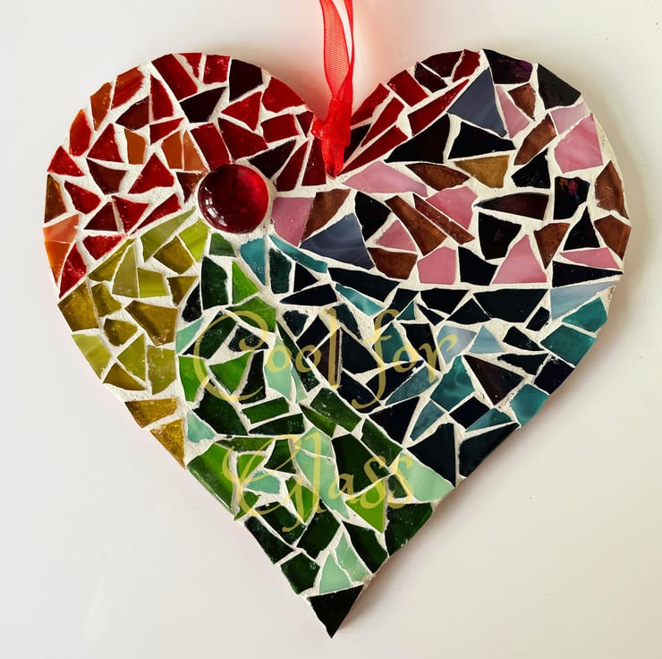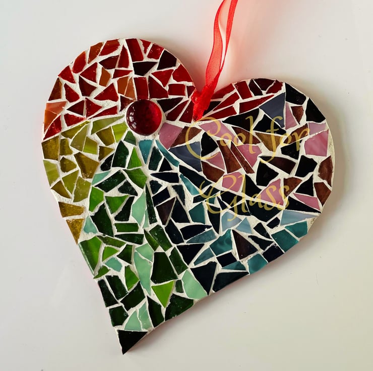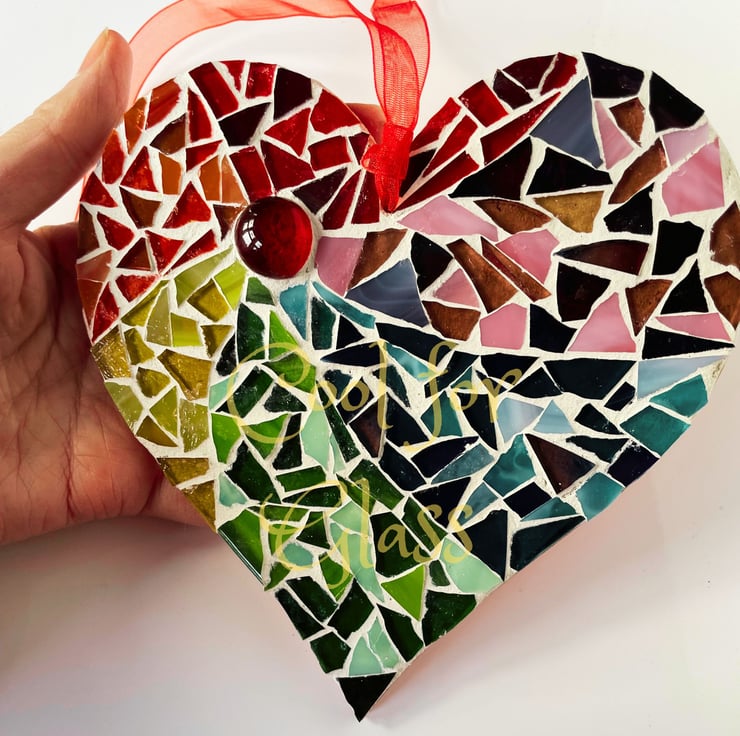 Each tiny piece of glass has been individually positioned and glued to a MDF heart base. The presentation side is grouted and the back is sealed with a couple of coats of acrylic paint. A simple ribbon is attached allowing you to hang the heart against a wall.