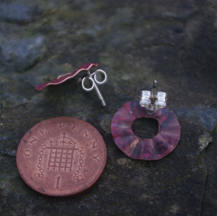 Simple circular stud earrings with a hole in the middle made using copper sheet designed so that the bottom edge hangs just below the earlobe. The circles have a wavy surface and have a diameter of 15mm/ over half an inch. The luscious red tones on the copper are achieved using heat and are preserved with a penetrating wax.