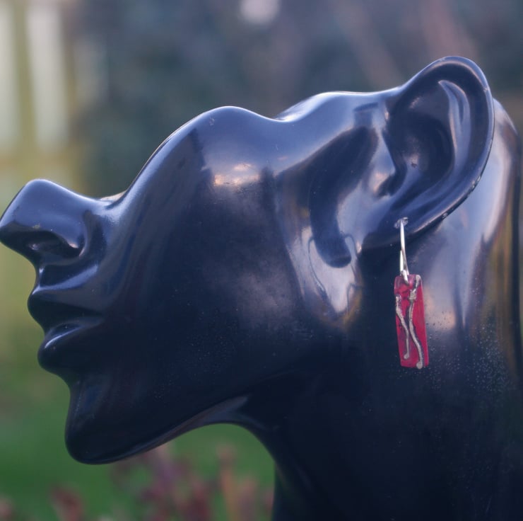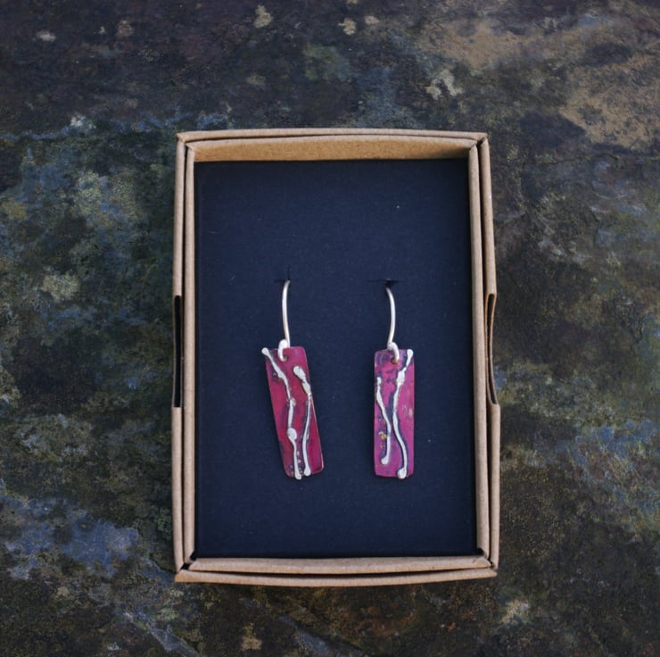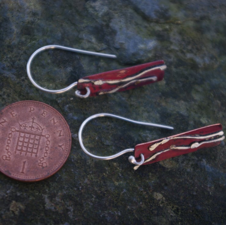 The deep red and dark red tones of the recycled copper have been achieved with heat and are preserved by a penetrating wax. The dangle is 35mm/ nearly 1.5 inches from the top of the handmade eco sterling silver earhook.