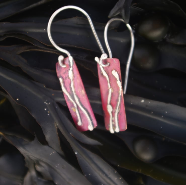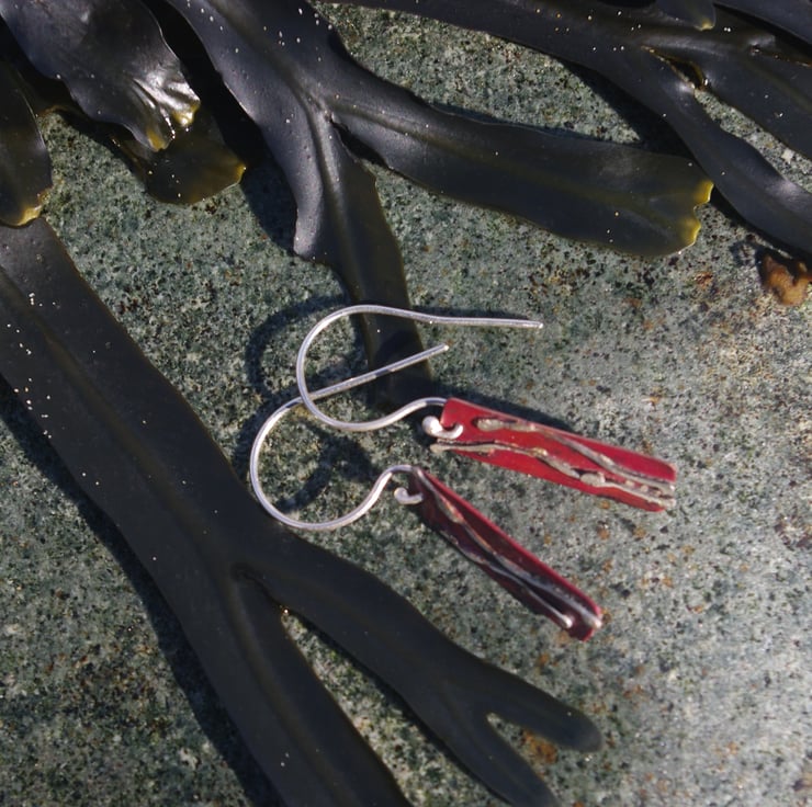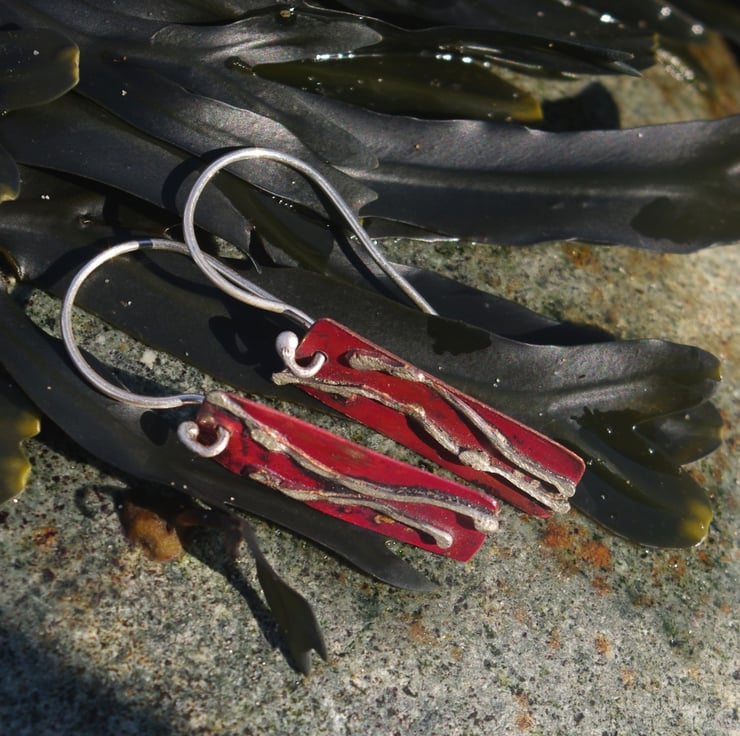 Copper rectangle earrings with stripes of sterling silver wire; inspired by seaweed on the coast in West Wales.