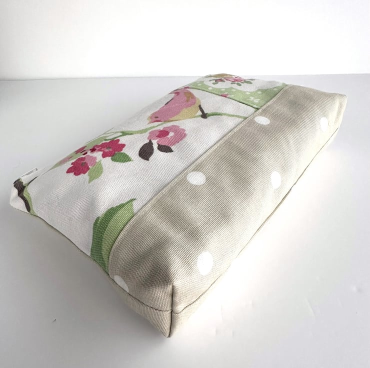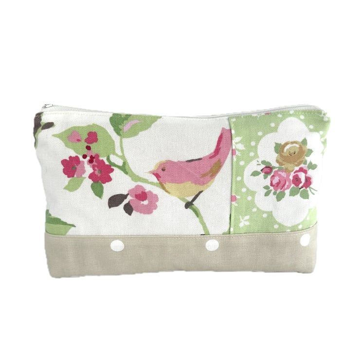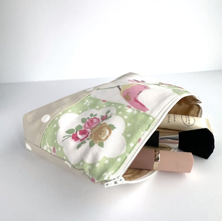 This large make up bag is made from three print fabrics. The front of the cosmetic bag consists of three panels. The upper part of the front of the bag is made up of two asymmetric panels of matching fabric. The wider panel features a cute little garden bird, perched on a floral and leafy stem. The pattern is depicted in pastel shades of pink, green and pale yellow on a white background. The narrower panel, in similar colours, features a cluster of pink and golden yellow roses, and green leaves. The rose cluster sits in the centre of a white scalloped shape, surrounded by white polka dots, on a pale green background. The lower section of the front, and the entire back, is made from beige fabric with white polka dots. The make up bag fastens with an off-white zip and is lined with golden yellow fabric with a woven pattern of small squares. The base of the bag is boxed giving plenty of room inside.