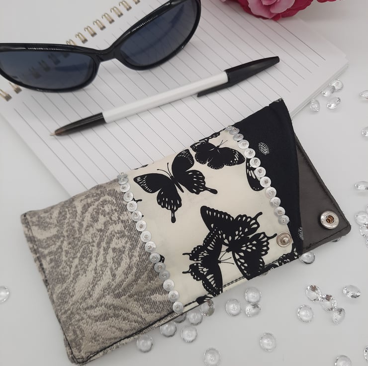 Glasses case made with 3 contrasting fabrics. One eye catching butterfly print poly cotton, silver and grey textured fabric and a black fabric with embroidered silver droplets.