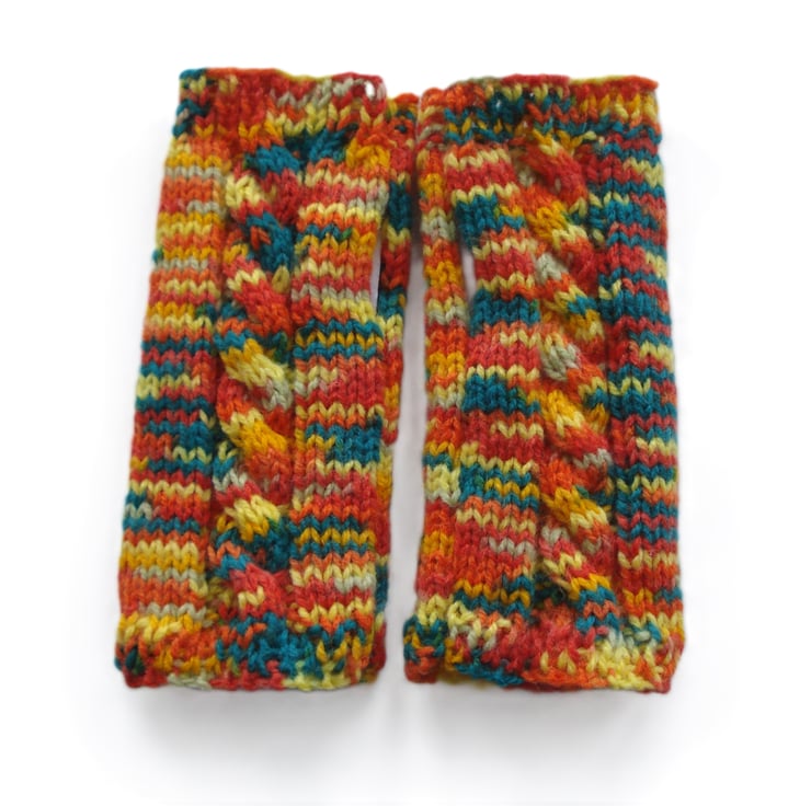 This is a pair of hand knitted fingerless gloves in a thick multi coloured Aran wool and acrylic yarn. There is an opening at the side to take the thumb and the cable pattern is on the front and back. Lovely colours orange, yellow and green. Nice long cuff to fit under a coat sleeve.