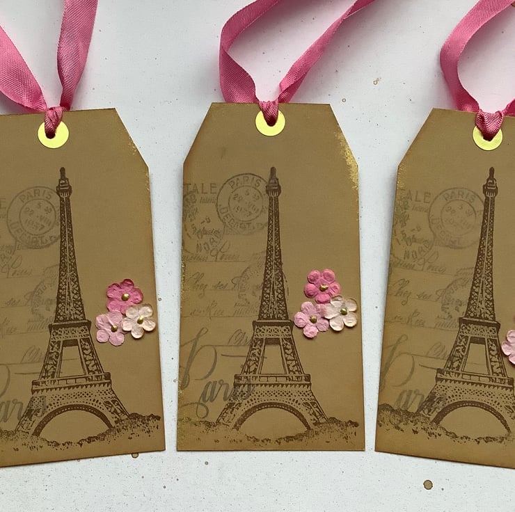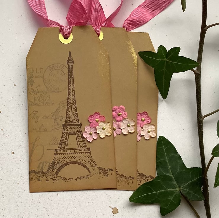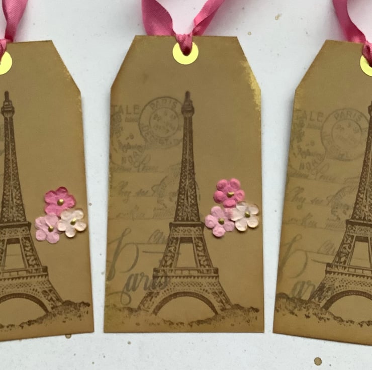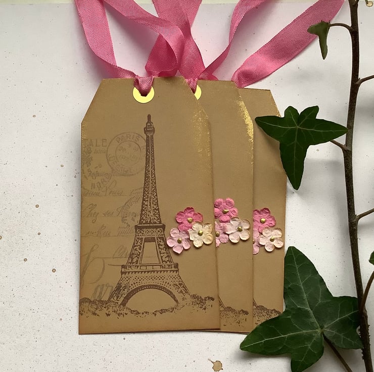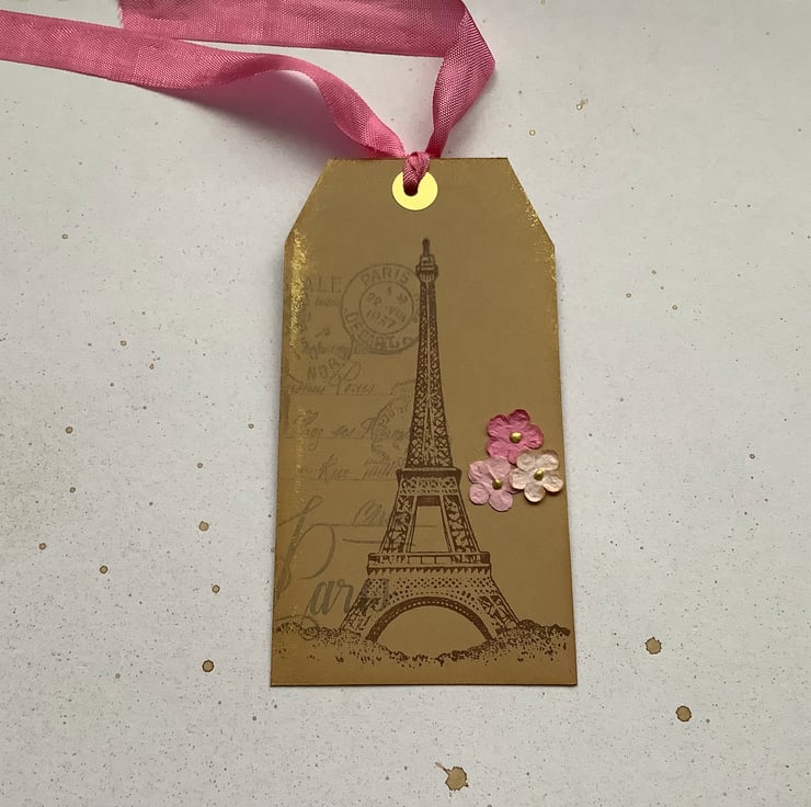 I have hand -stamped various Paris-themed images on to high quality kraft brown card , then 'aged ' the edges with sepia and gold inks .Finished with some mulberry paper flowers and lovely ,silky ,vintage -style ribbon !! Tres jolie !