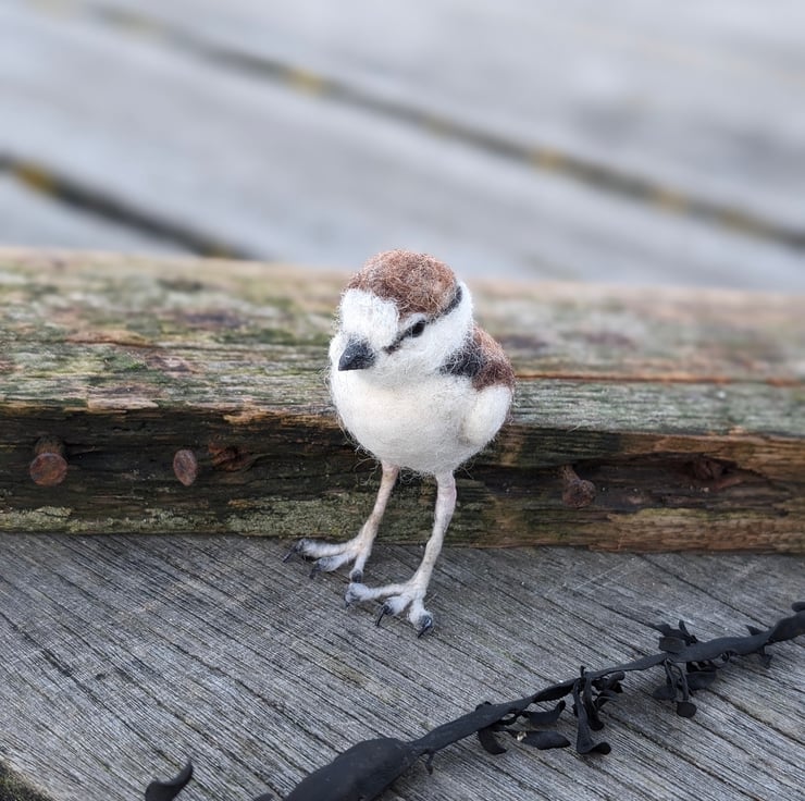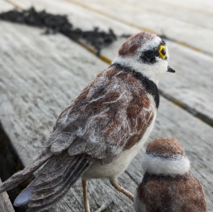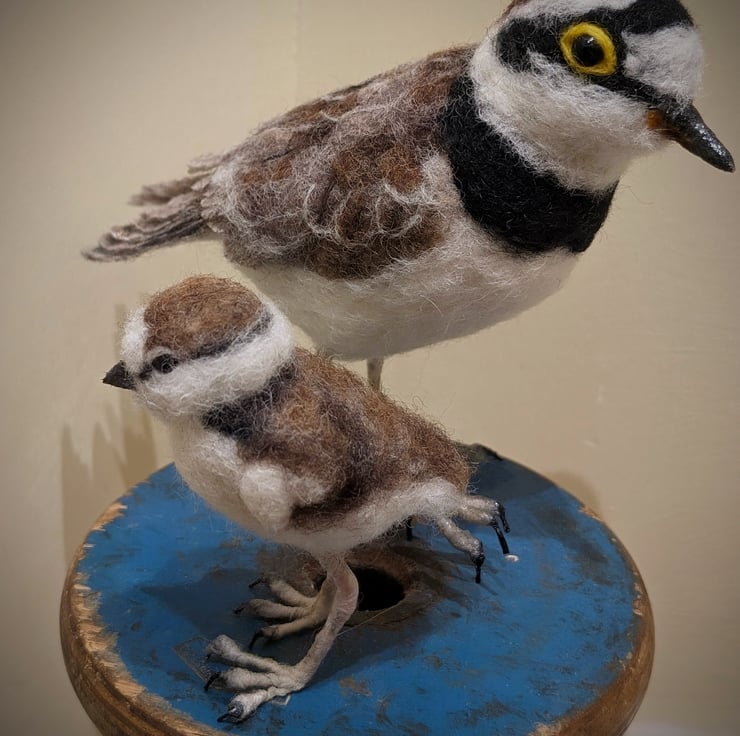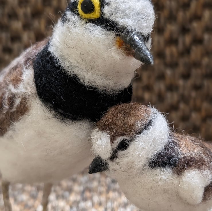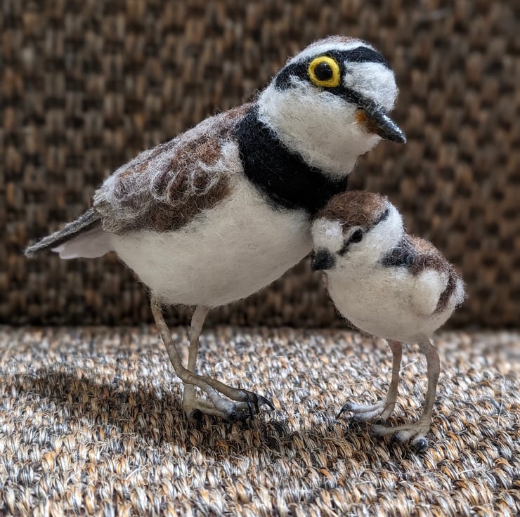 Two Little Ringed Plovers, a parent and chick hand-made and sculpted in wool, to be treasured together.
