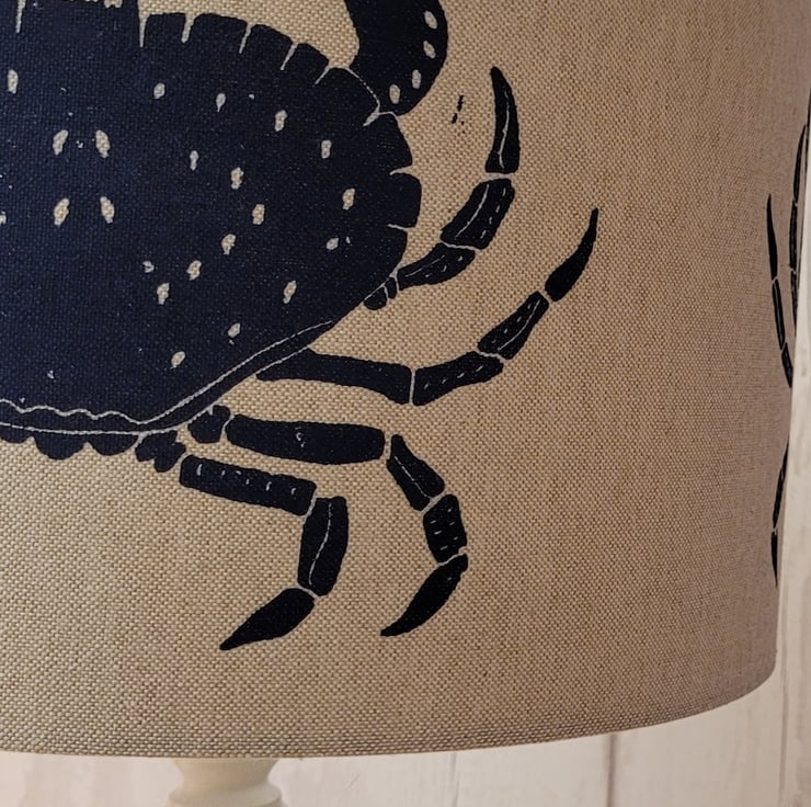 This lampshade features three navy blue crabs, hand printed onto linen fabric.