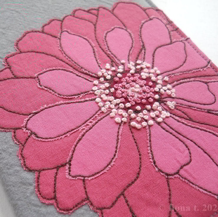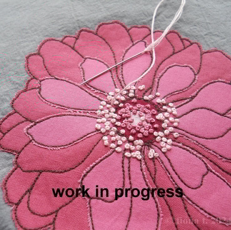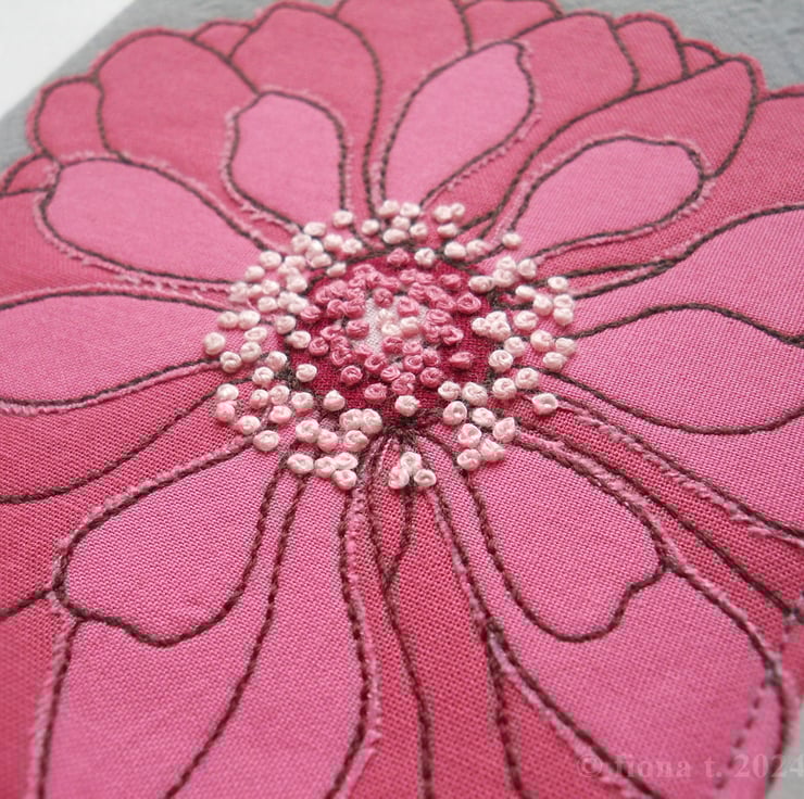translated from my original pencil sketch, this flower is free hand embroidered in rose pink, blush pink and dark red cottons on to hand dyed grey cotton calico.