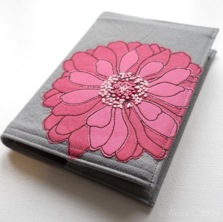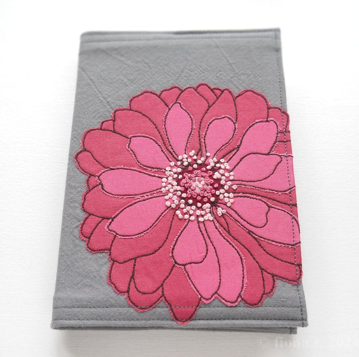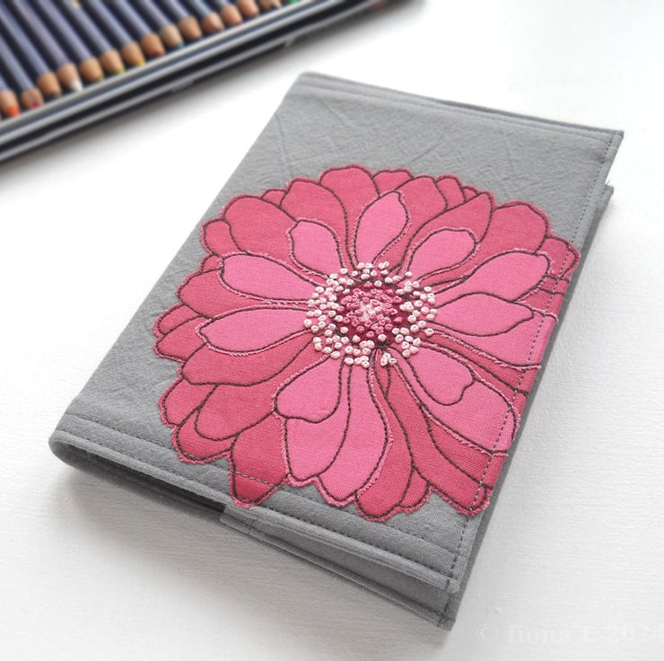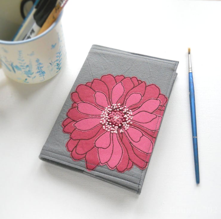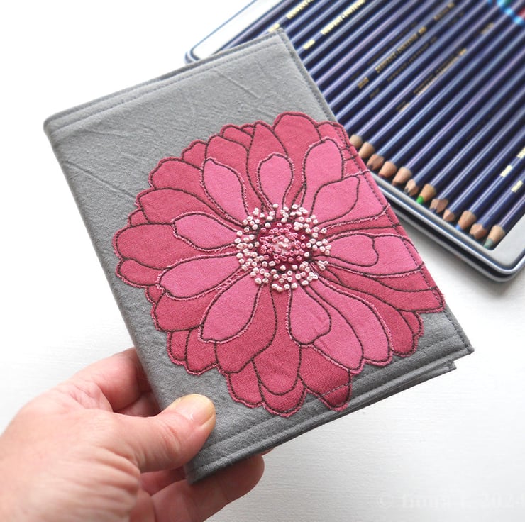 free motion and hand embroidered A6 notebook cover with sketchbook inside – rose pink & blush pink