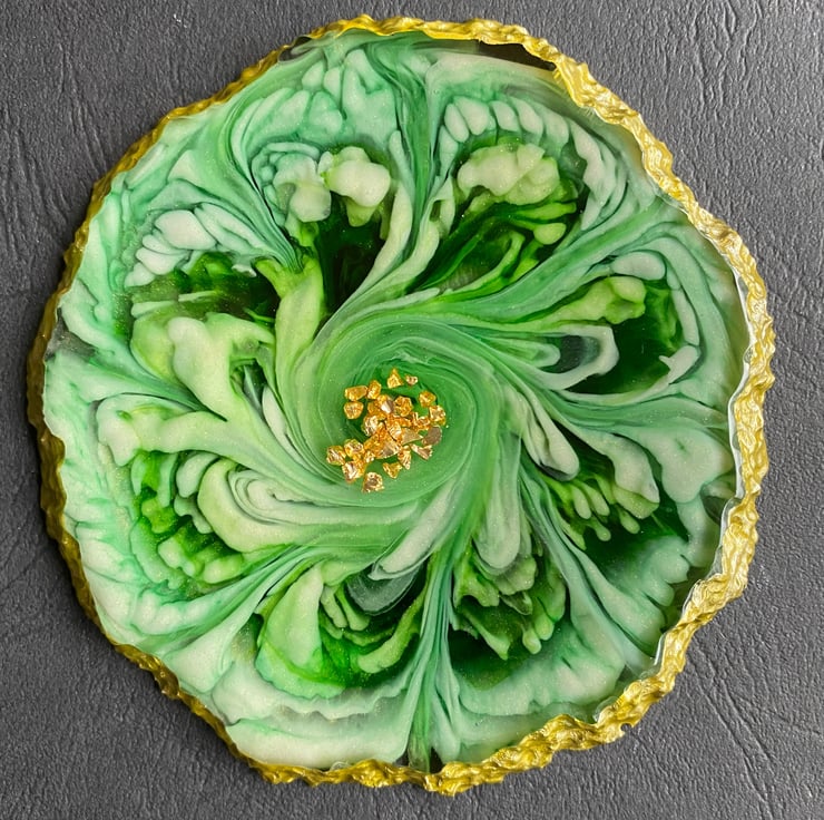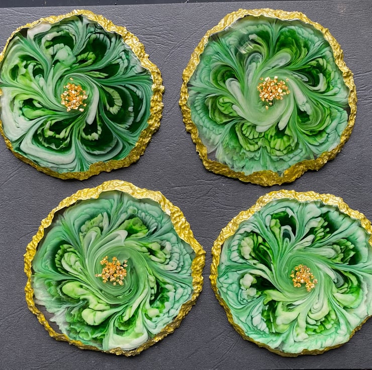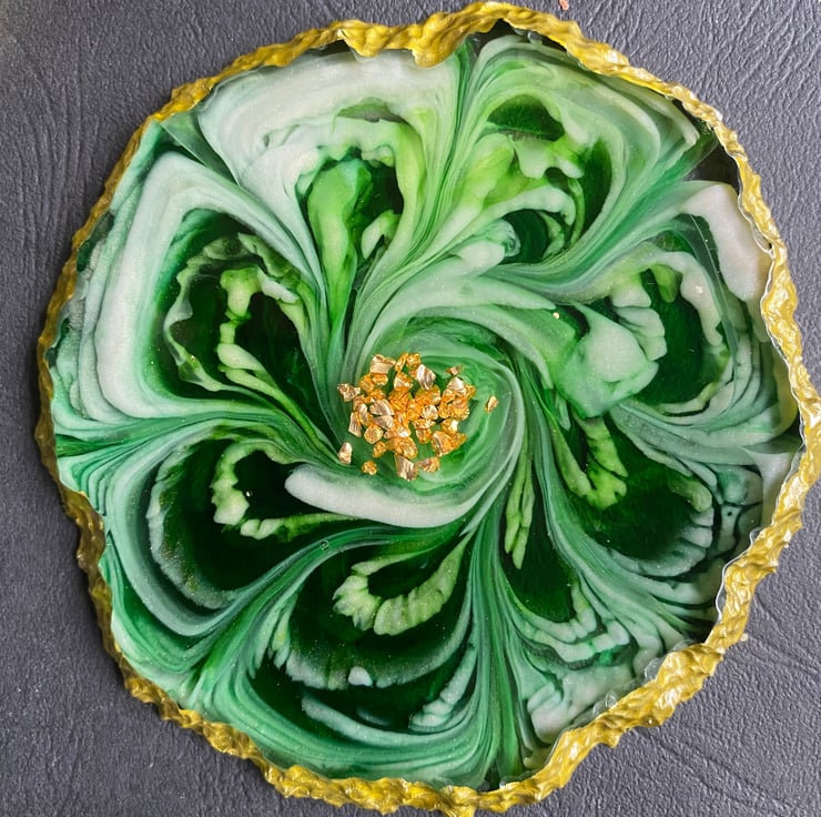I love the combination of nature inspired and colour. The coasters are made in a geode resin mould and blended with the greens and white to produce the pattern and highlighted with gold.