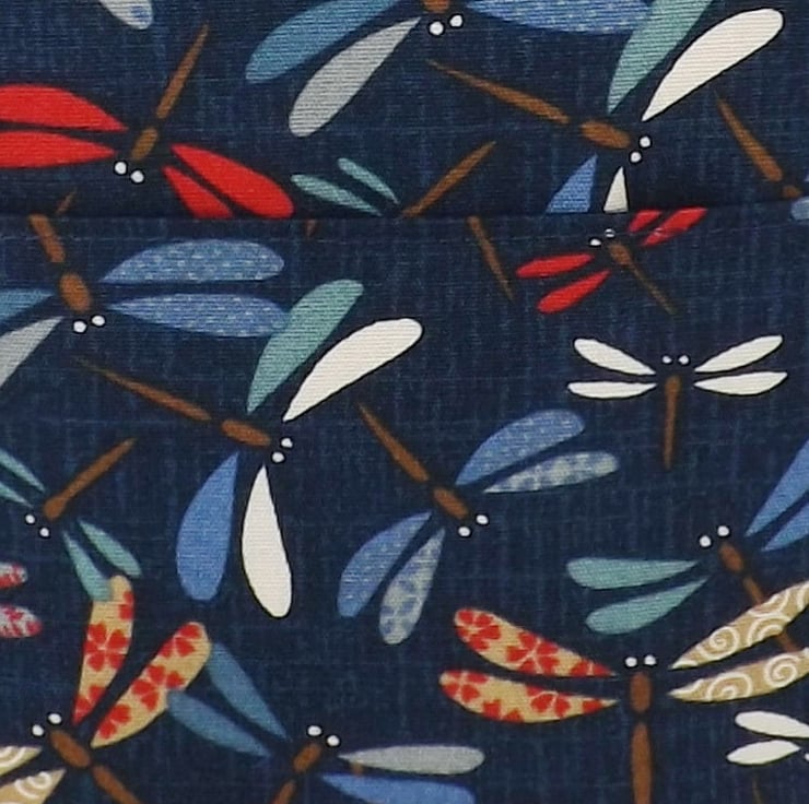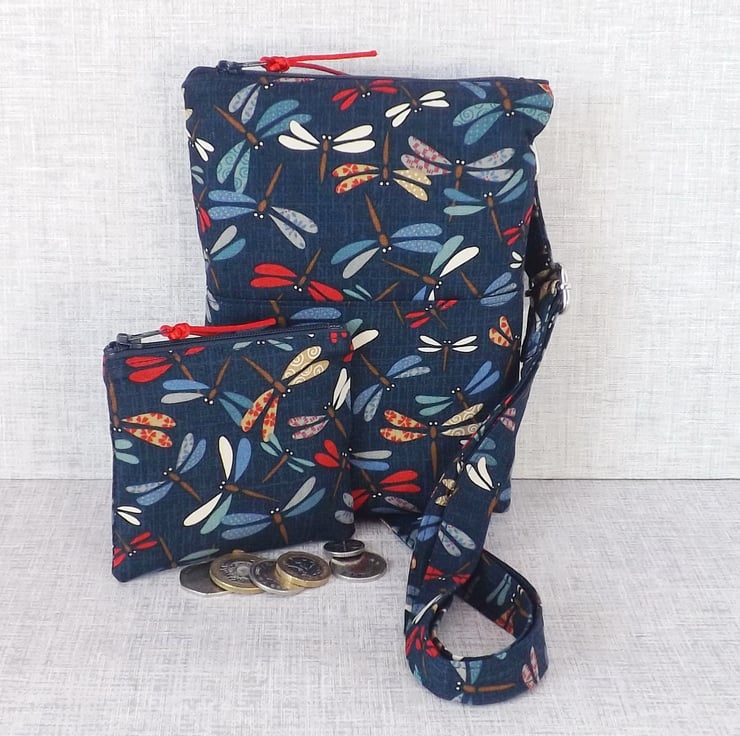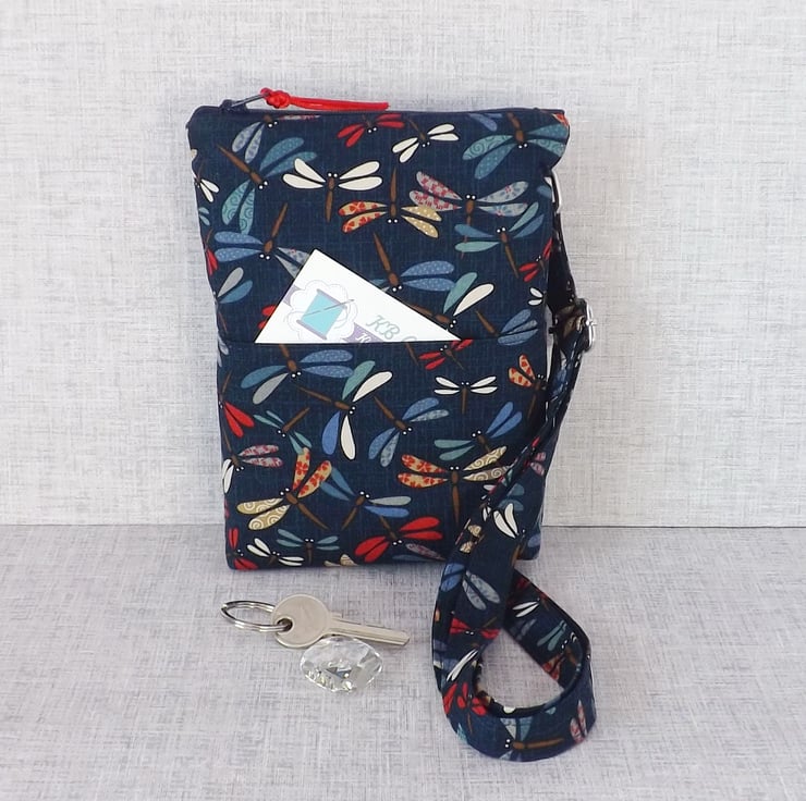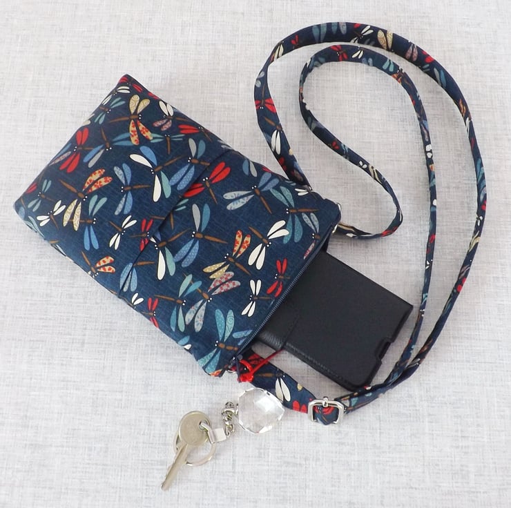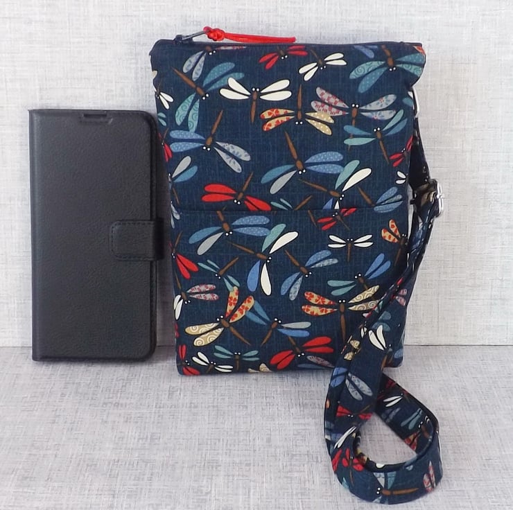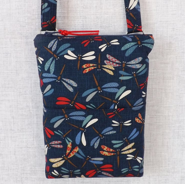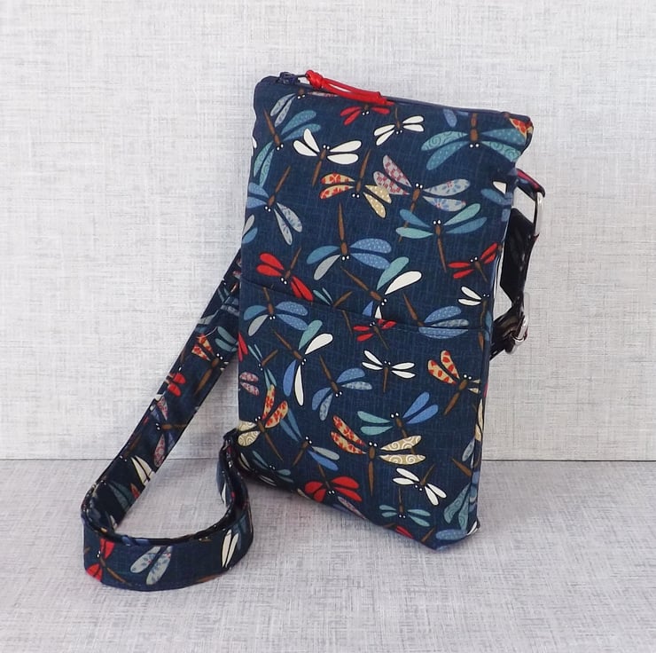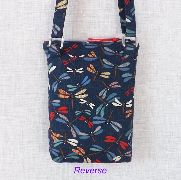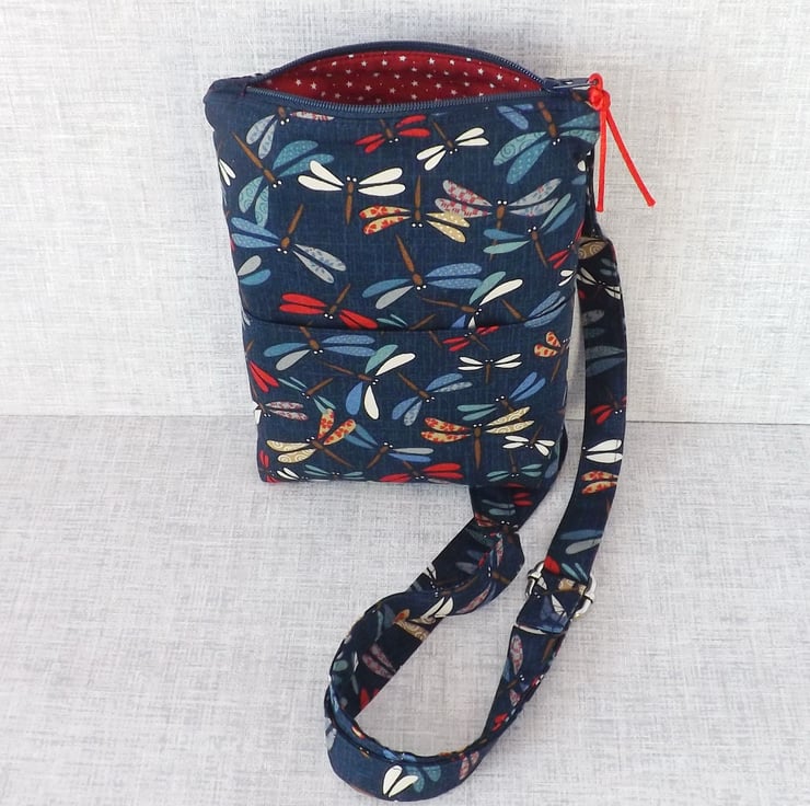 A phone bag or small cross body bag made from 100% cotton fabric. The main fabric has a dragonfly design in shades of red, brown, cream & blue on a dark blue linen effect background. It is lined in a red cotton fabric with white stars on, and is fully interfaced.