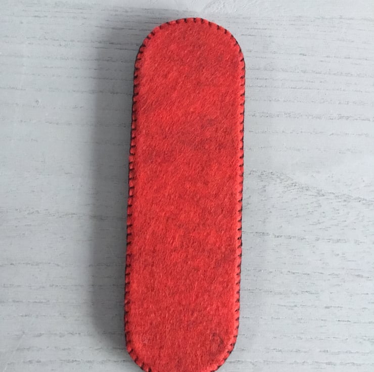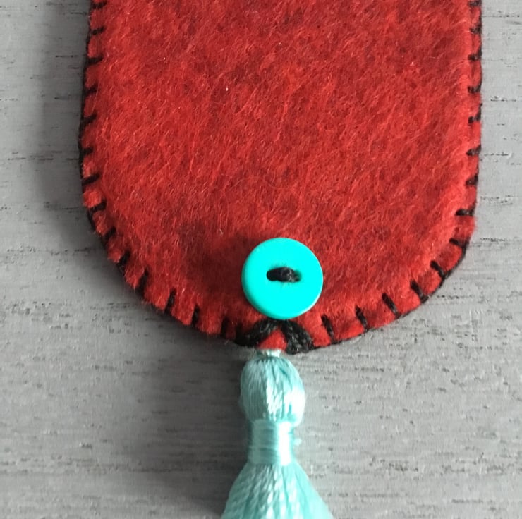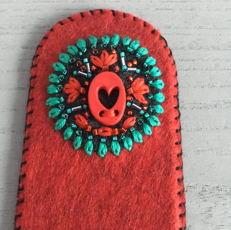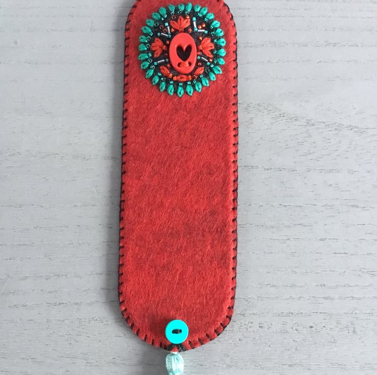 This Hand Embroidered Red Heart Bookmark has a unique red button showing a small cut out Heart shape, stitched onto a circle of dark grey felt. This Heart button is surrounded by hand embroidered Lazy Daisy Stitches with seed and bugle beads in red and turquoise embroidery threads. This bookmark is made of red heritage wool felt with a small turquoise button and tassel at the bottom.