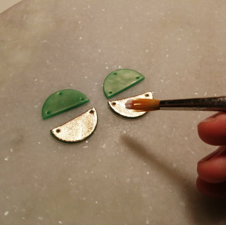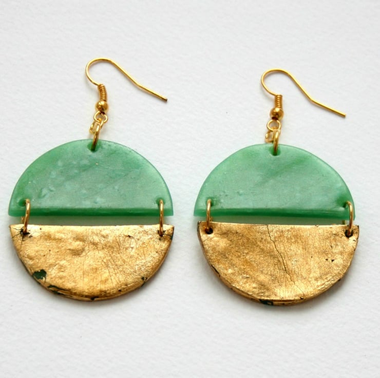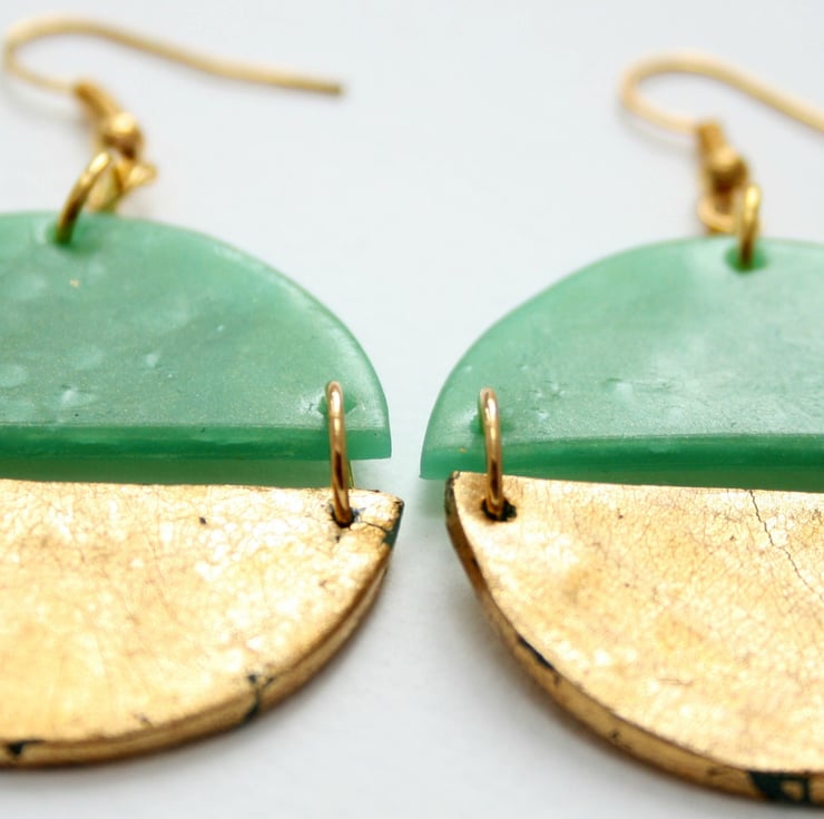 These earrings are handmade by me in my studio in Scotland. I will make these round dangle earrings to order. I use lightweight polymer clay for the circle. The front of the bottom half circle is gilded with 24k gold leaf. The earring hooks are made of gold plated 925 sterling silver. The jump rings are gold-plated brass.
