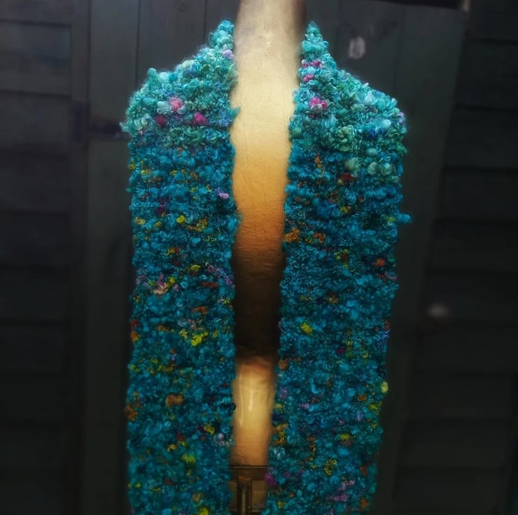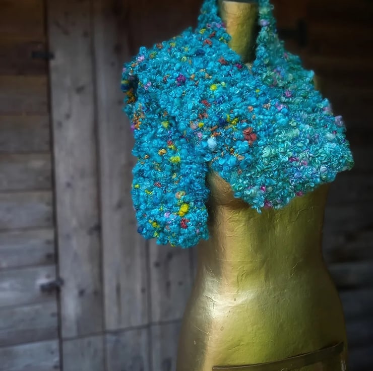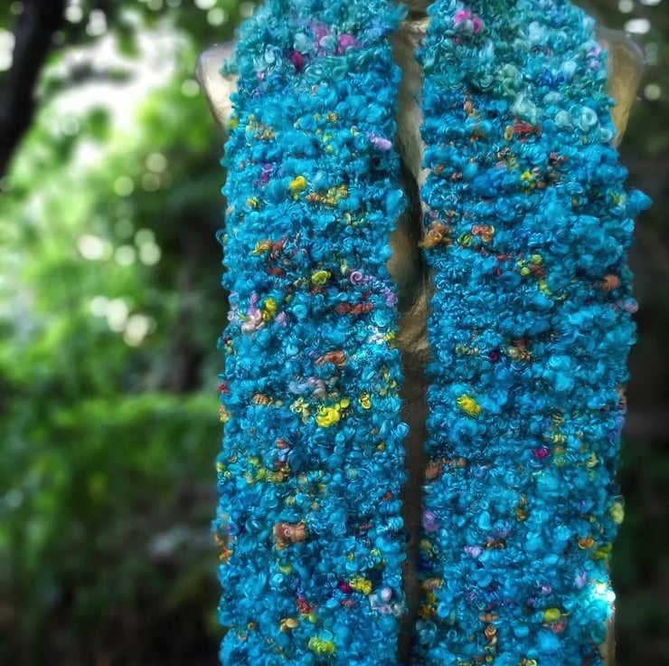 The yarn that I’ve used for this scarf is best described as both 'thick and thin' meaning that the gauge varies significantly and eccentrically throughout, and 'art yarn', meaning that the spinner has added multi-textural colour accents, lustrous 'locks' and fibre clusters that drawn the eye and capture the imagination. It is quite simply stunning. In shades of ocean blue, and with pastel-and-gemstone coloured accents it's wearable art in the truest sense.